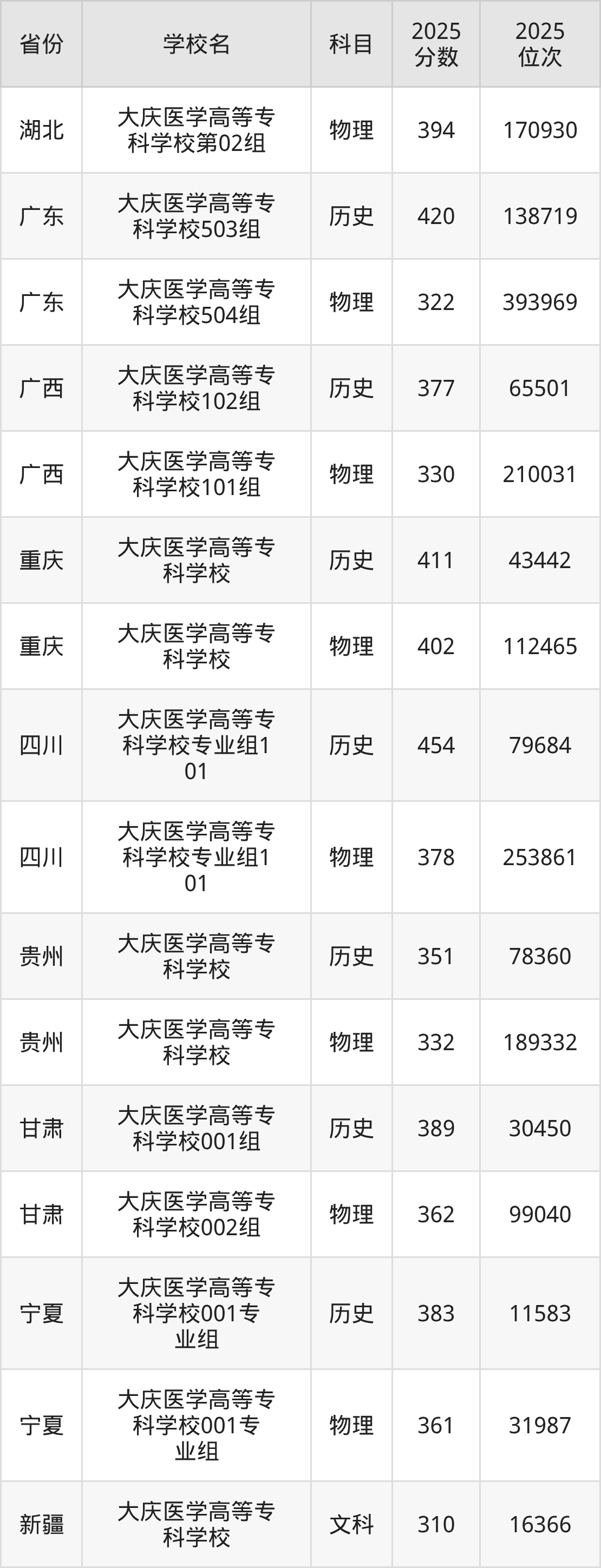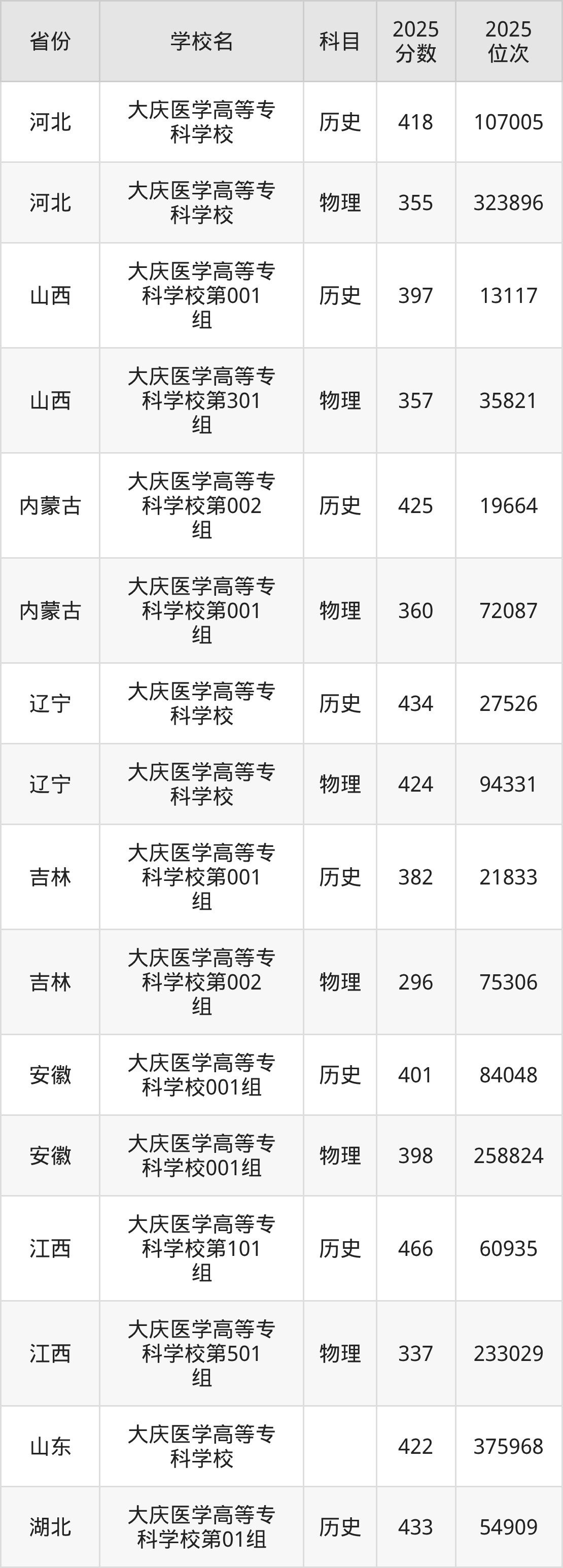 下面是大庆医学高等专科学校2025年录取分数线各省汇总,一起来了解下吧。