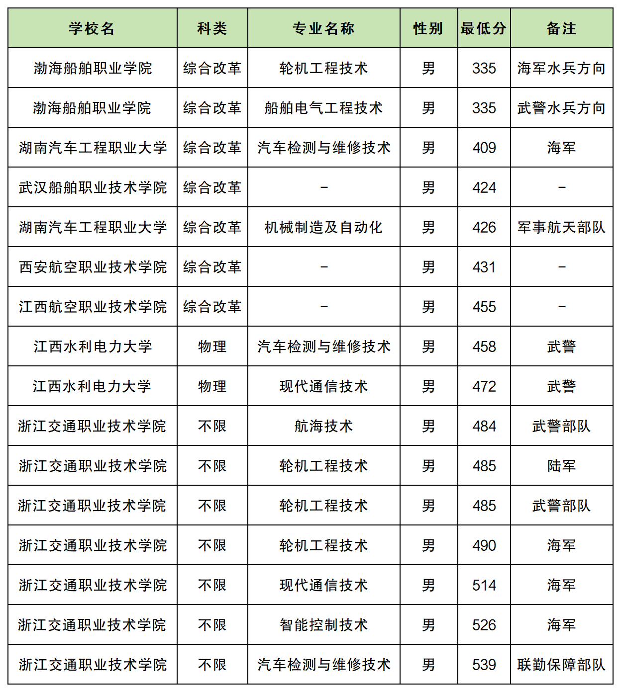 2025年在浙江招生的定向士官院校共计31所,包括重庆航天职业技术学院、浙江交通职业技术学院、渤海船舶职业学院等,完整名单如下: