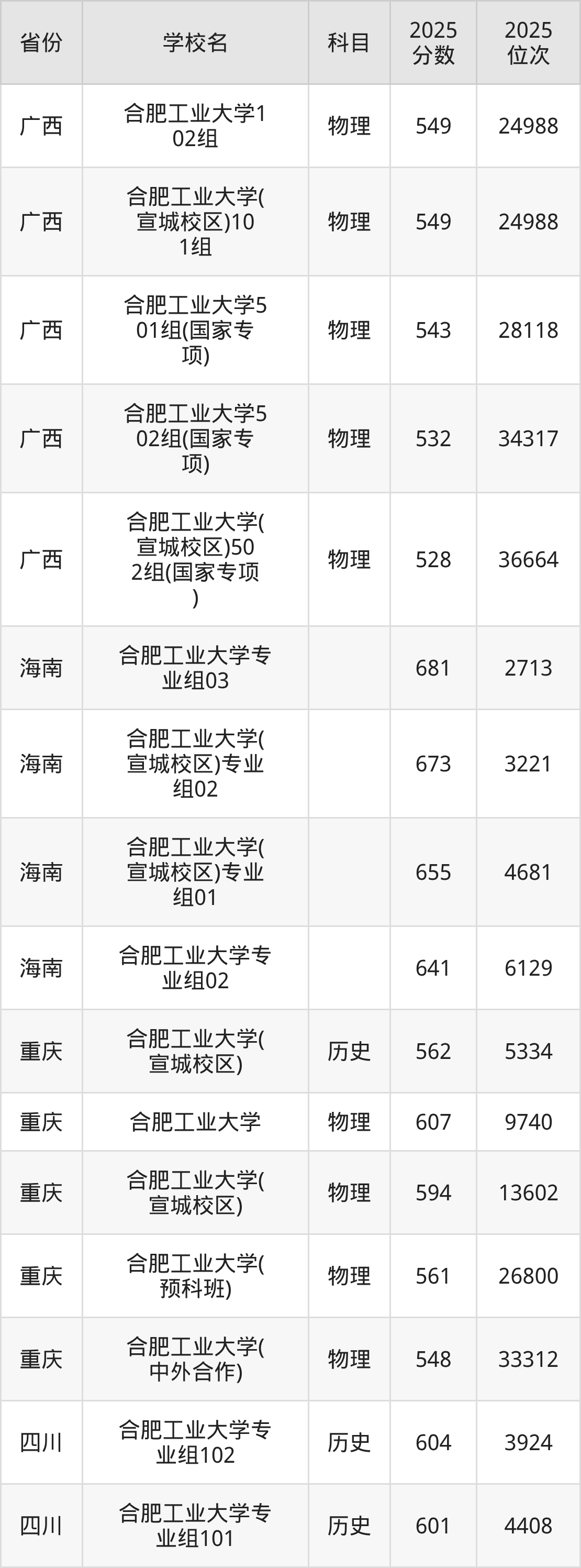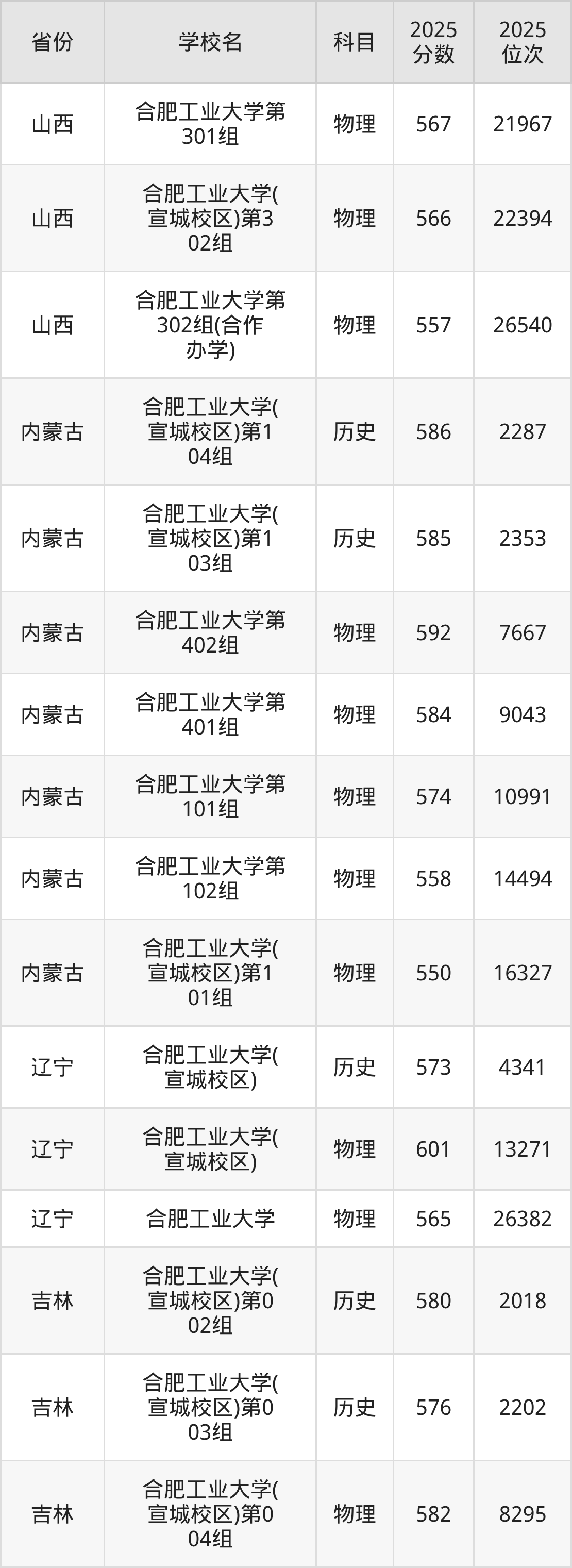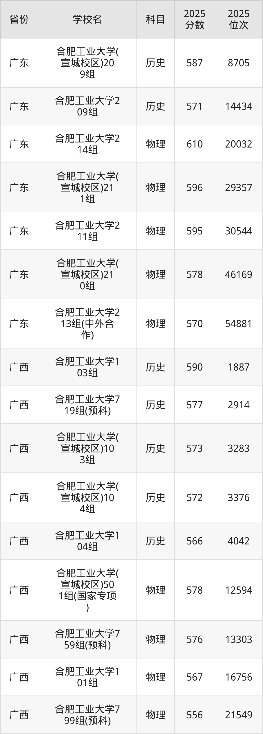 2025年合肥工业大学历史类最低分587分(5225名)、物理类最低分592分(32176名)。