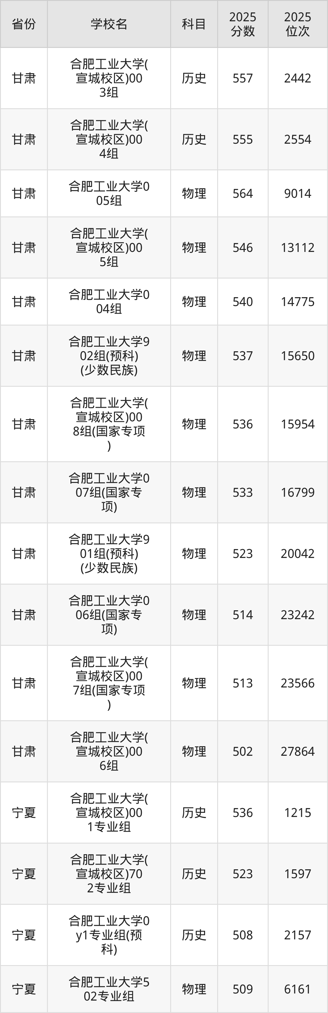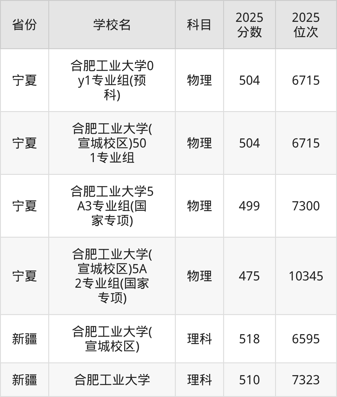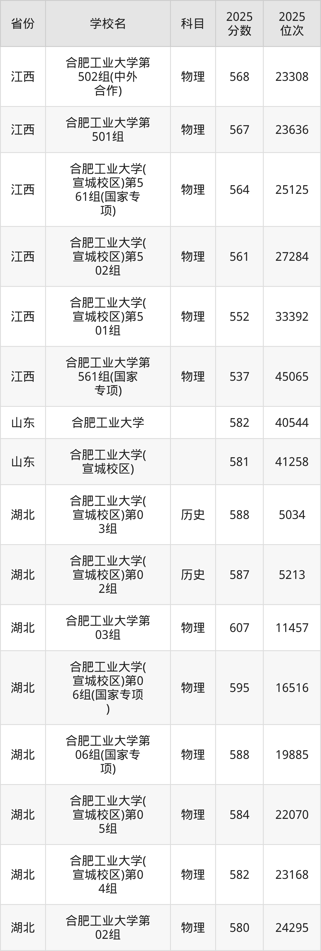 2025年合肥工业大学在省内分历史物理科目类录取,其中历史类最低分是587分、对应位次是5225名;物理类最低分是592分,对应位次是32176名。