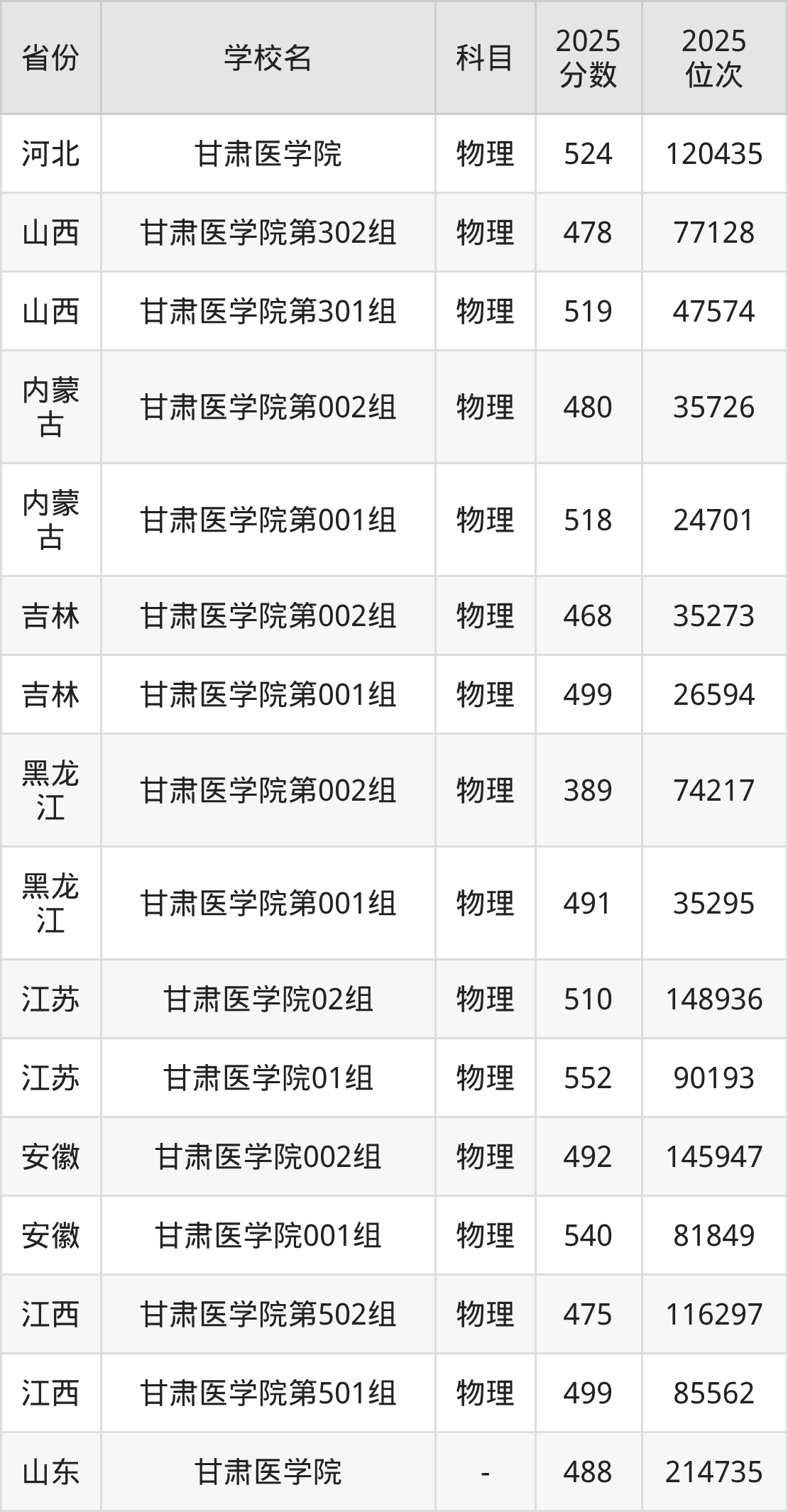| 甘肃医学院02 6组(其他民族 地区专项)(肃 南) | 物理 | 384 | 88949 |