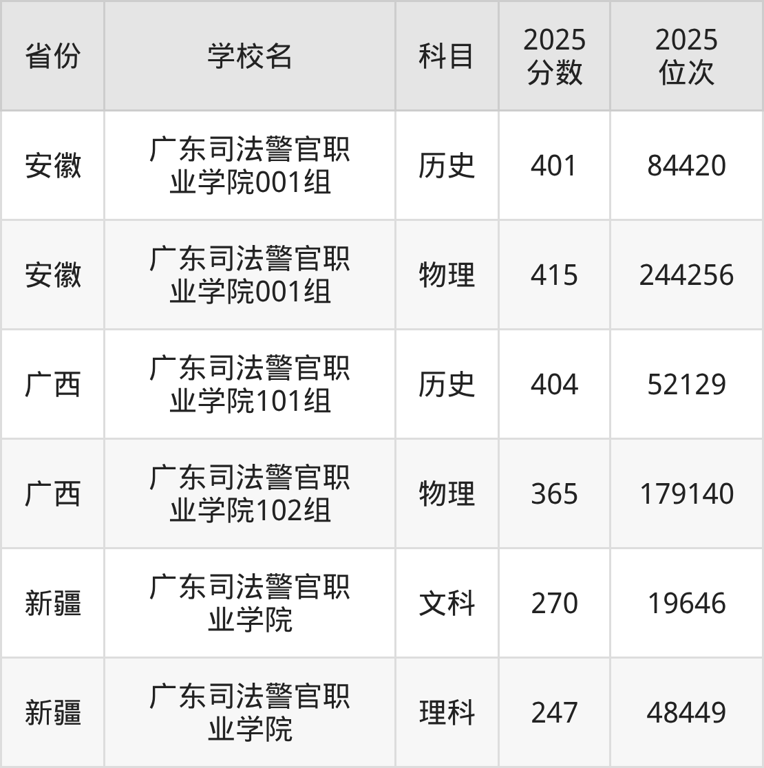 2026年广东司法警官职业学院录取分数线预计在410分及以上,在各省录取最低分存在一定差异,如:2025年广东司法警官职业学院在安徽录取最低历史类401分、物理类415分,在广东录取最低历史类424分、物理类395分,在广西录取最低历史类404分、物理类365分。