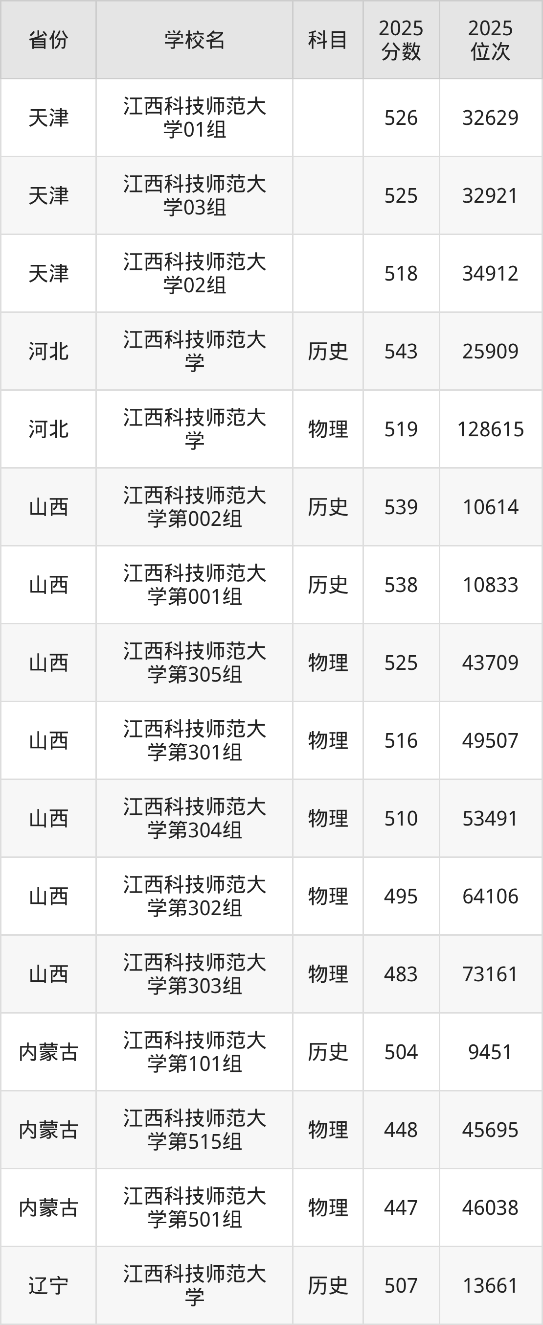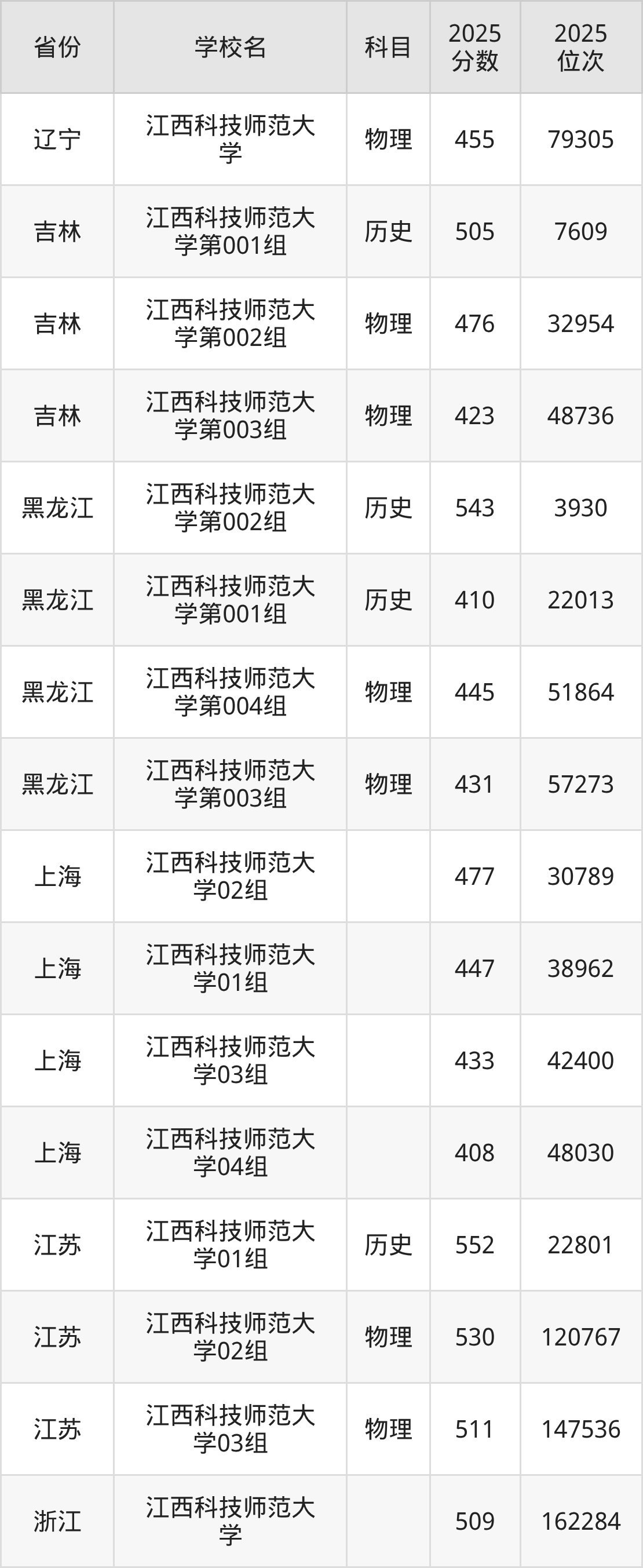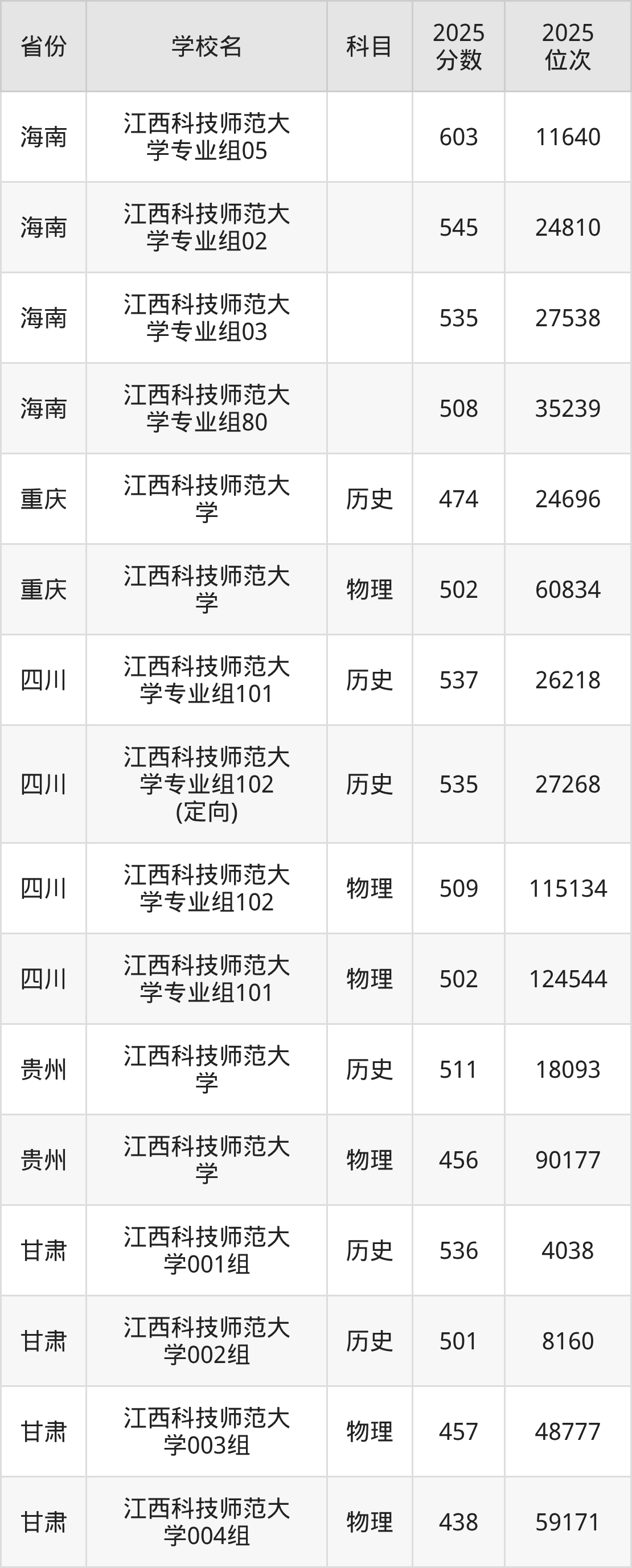 2025年江西科技师范大学历史类最低分496分(40359名)、物理类最低分458分(138800名)。