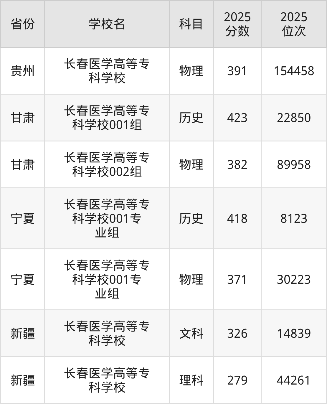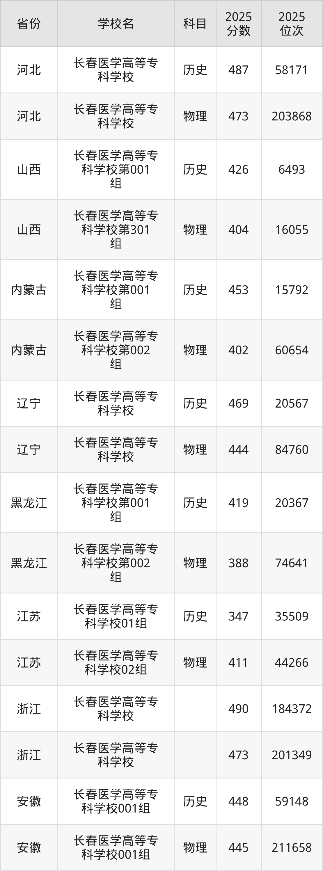 2025年长春医学高等专科学校历史类最低分371分(22886名)、物理类最低分234分(78432名)。