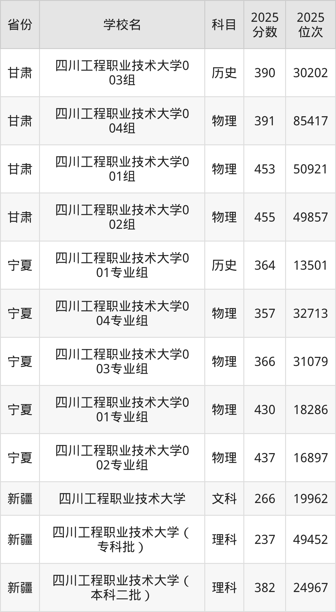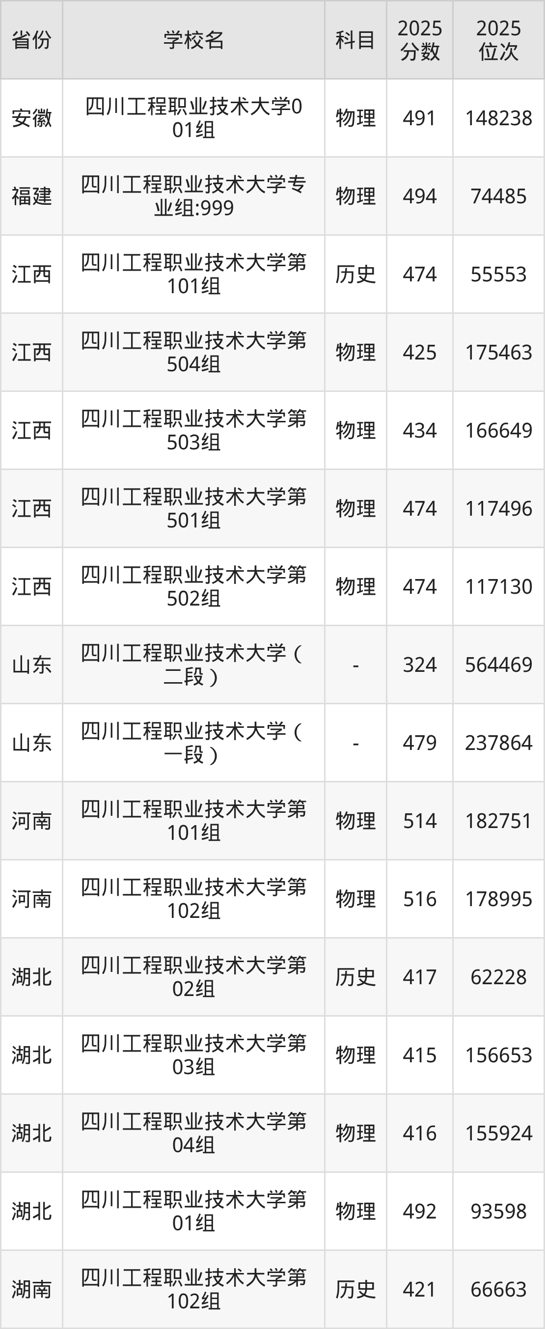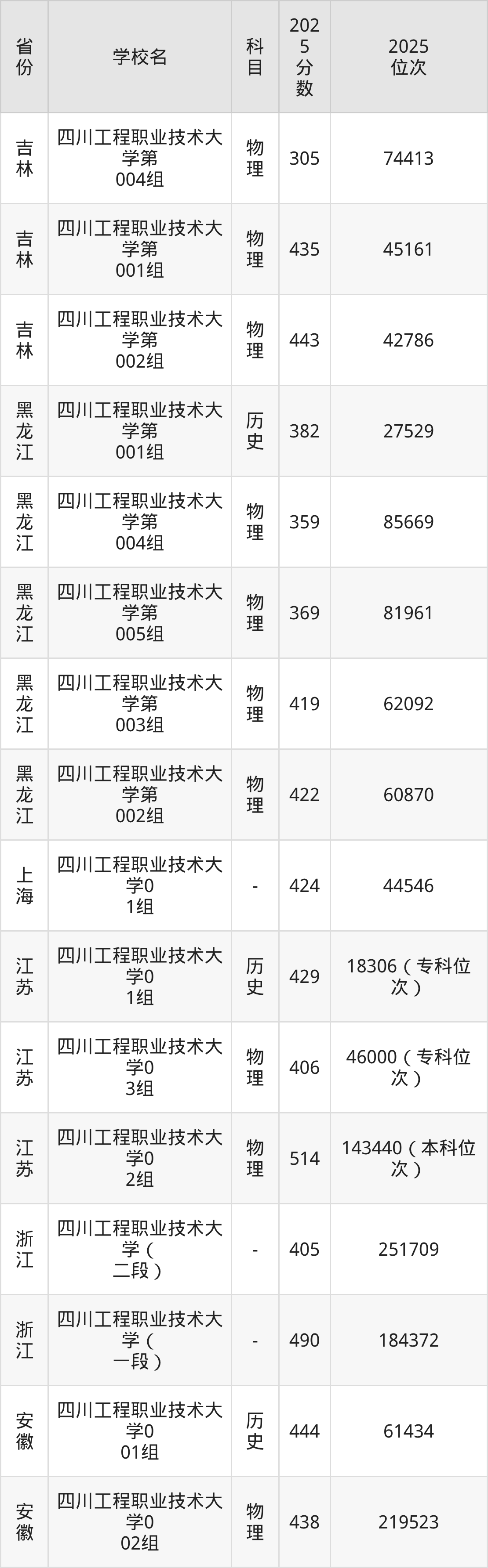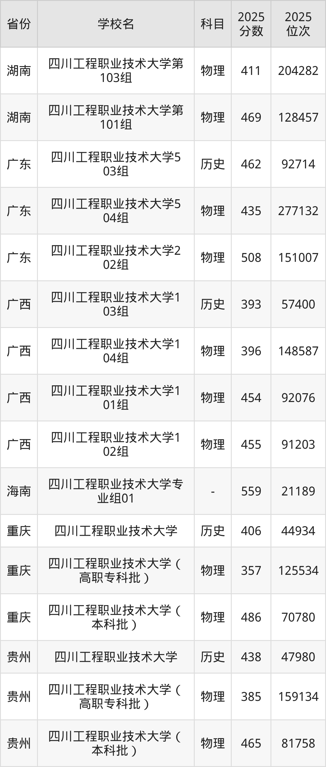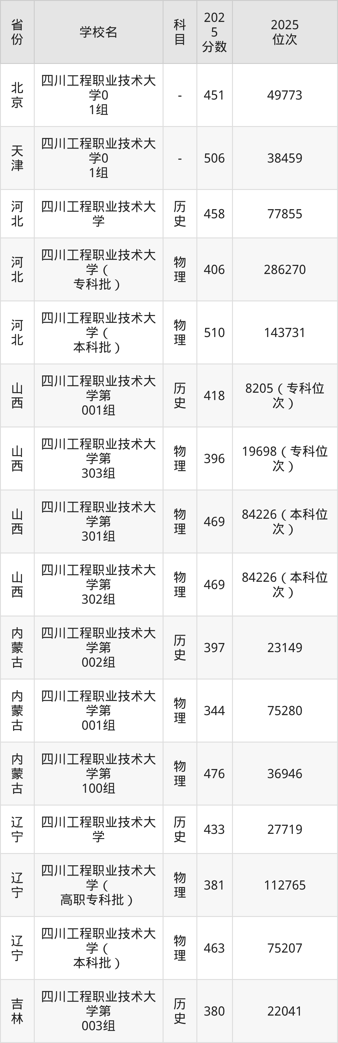 | 四川工程职业技 术大学专业组1 01 | 物理 | 503 | 123200 |