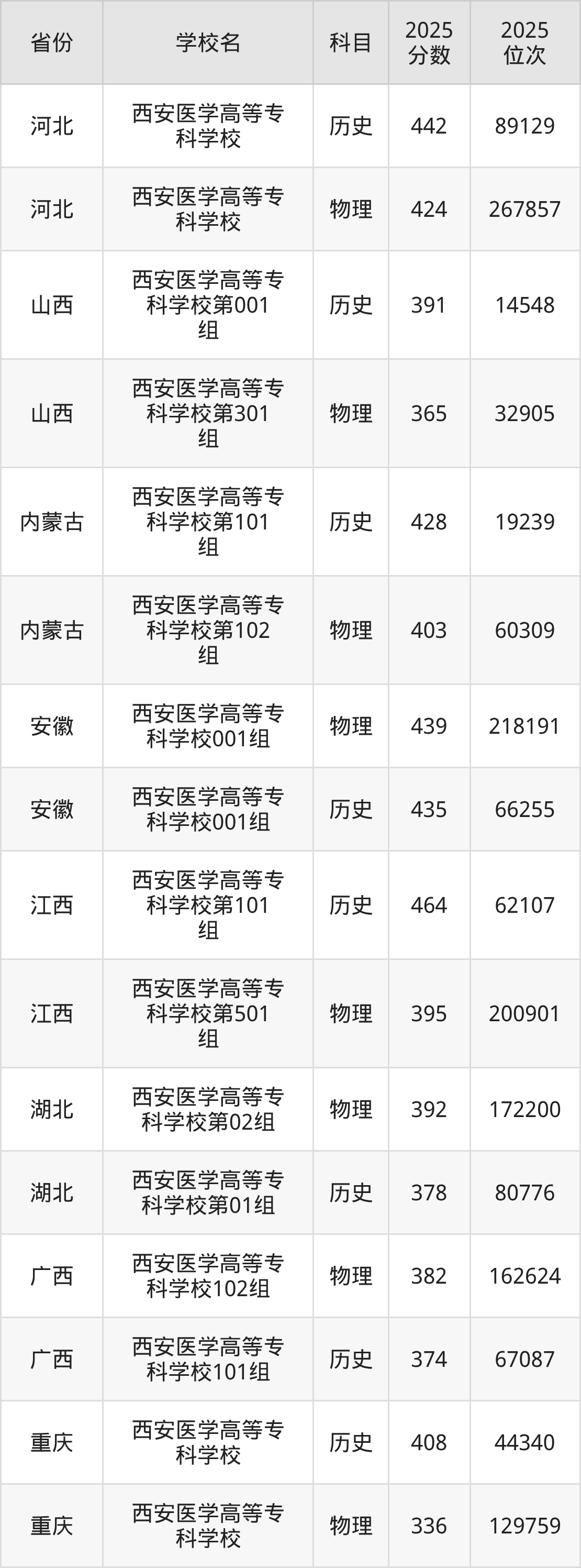 2026年西安医学高等专科学校录取分数线预计在360分及以上,在各省录取最低分存在一定差异,如:2025年西安医学高等专科学校在河北录取最低历史类442分、物理类424分,在内蒙古录取最低历史类428分、物理类403分,在安徽录取最低历史类435分、物理类439分。