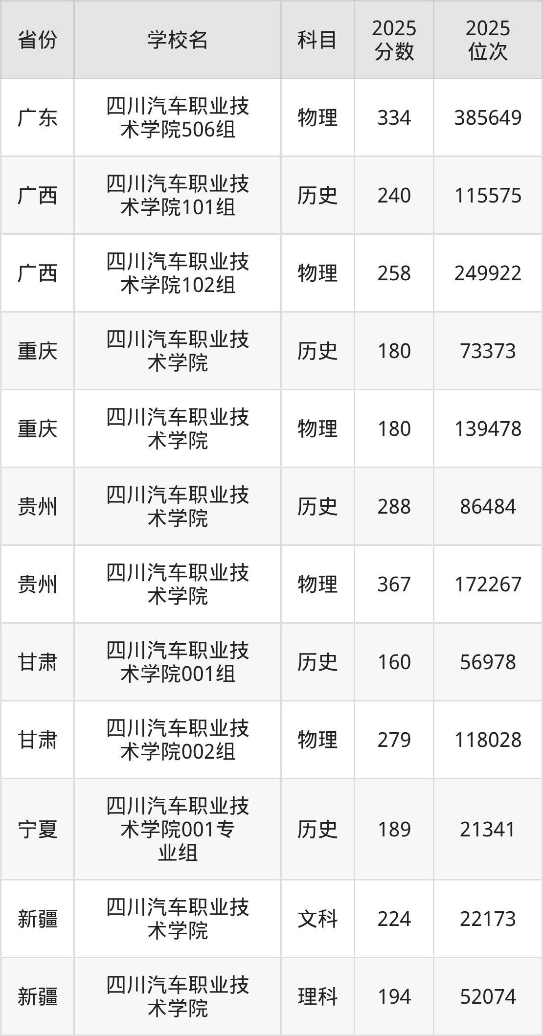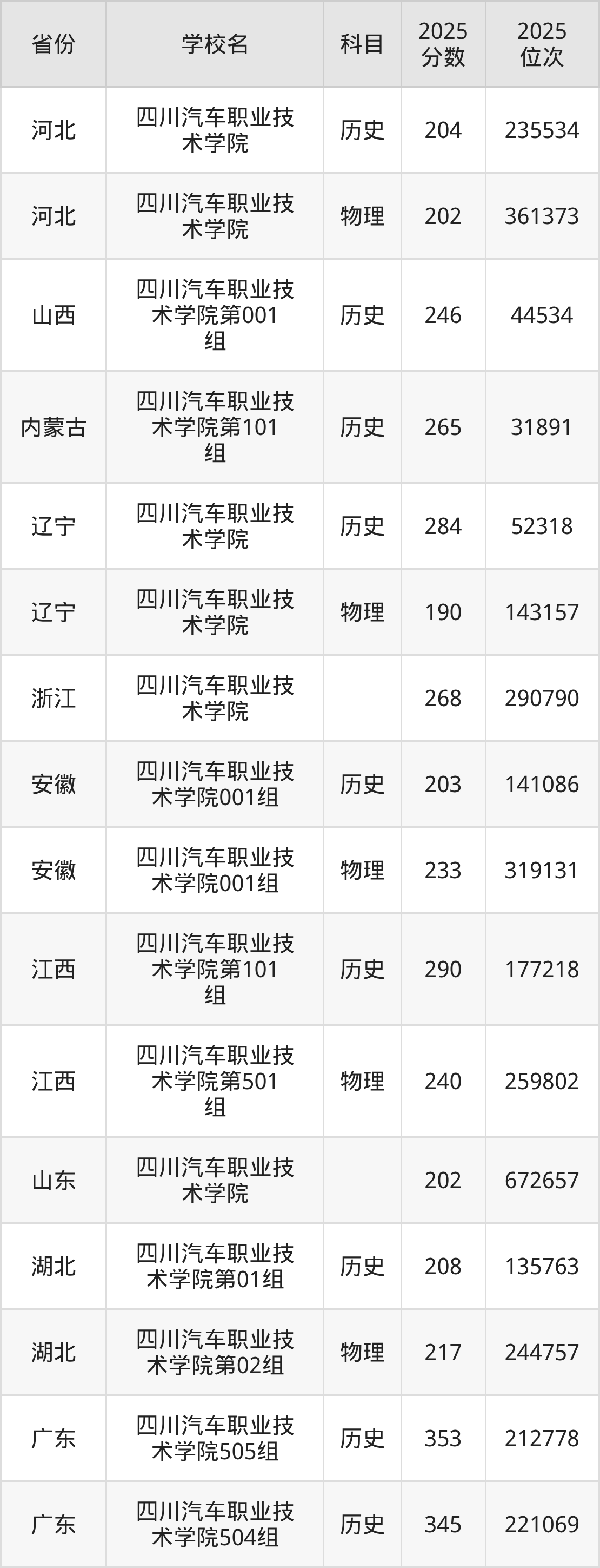 2025年四川汽车职业技术学院在省内分历史物理科目类录取,其中历史类最低分是150分、对应位次是177978名;物理类最低分是150分,对应位次是284789名。