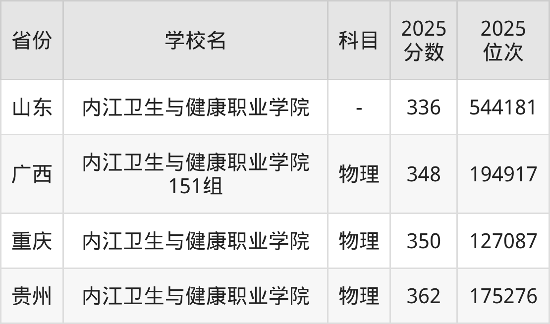 2025年内江卫生与健康职业学院在省外录取分数线范围整体位于336分到362分之间,录取分数线最低在山东、录取分数线最高在贵州物理。