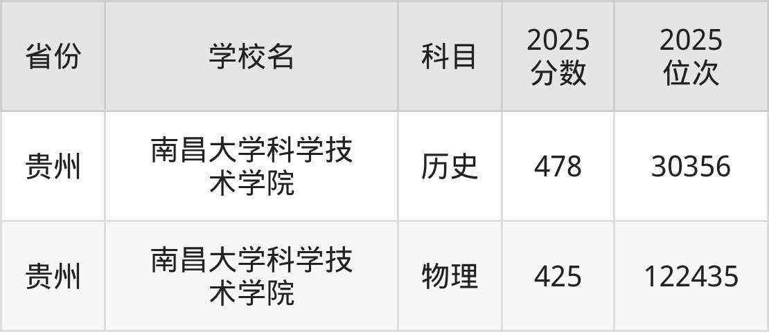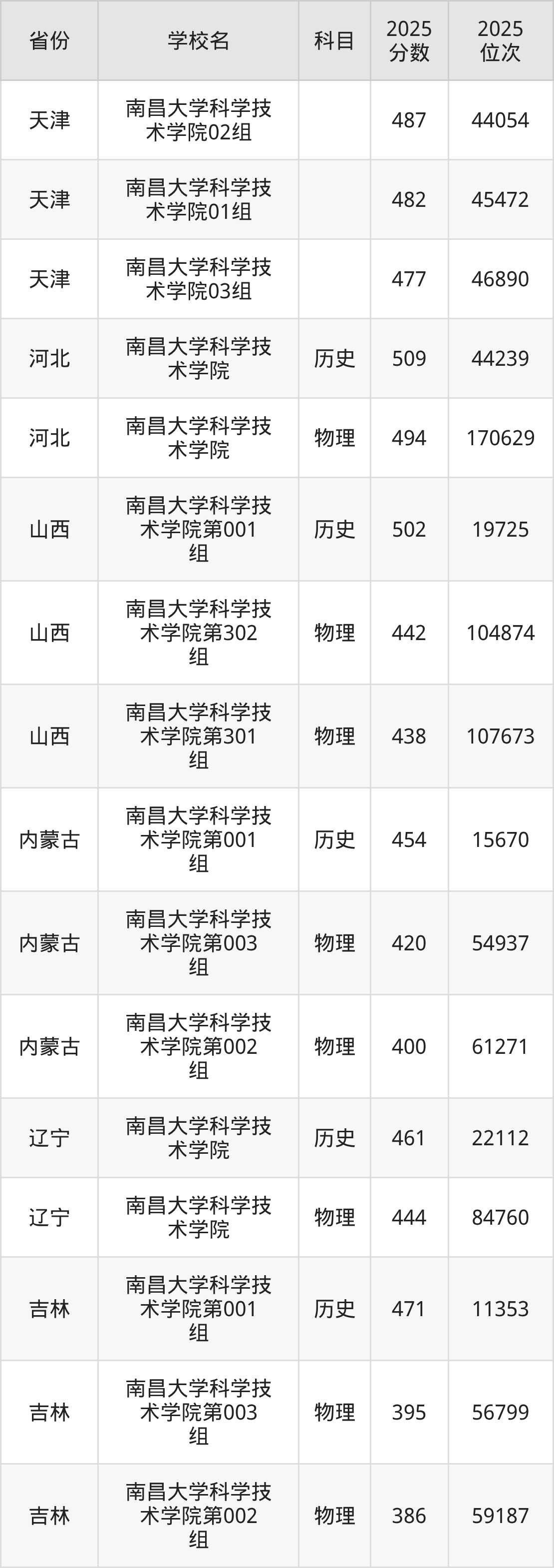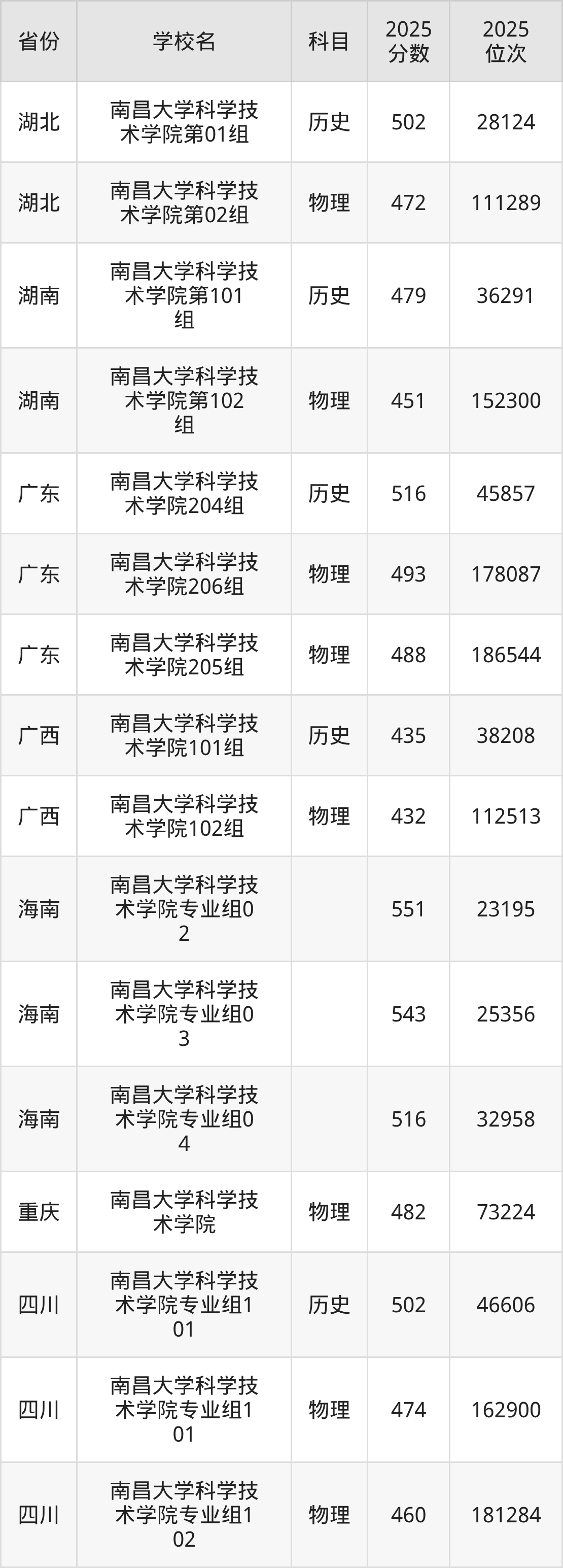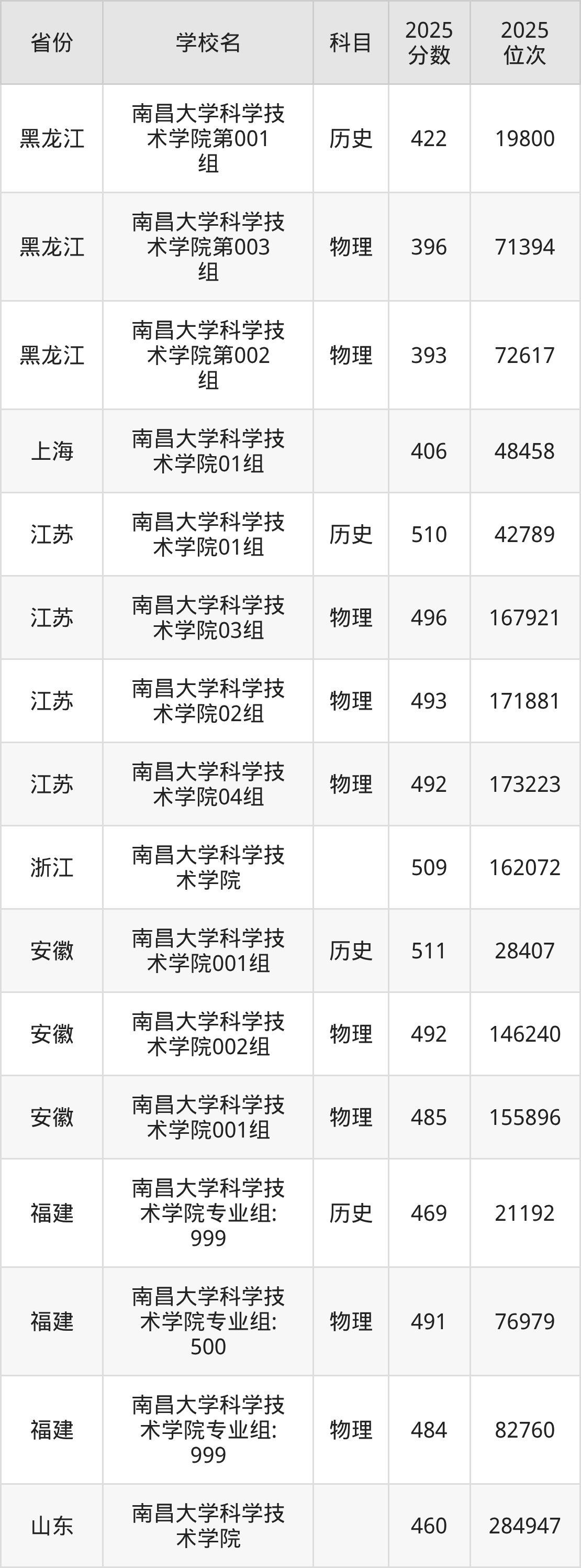 2025年南昌大学科学技术学院历史类最低分510分(31457名)、物理类最低分456分(140728名)。