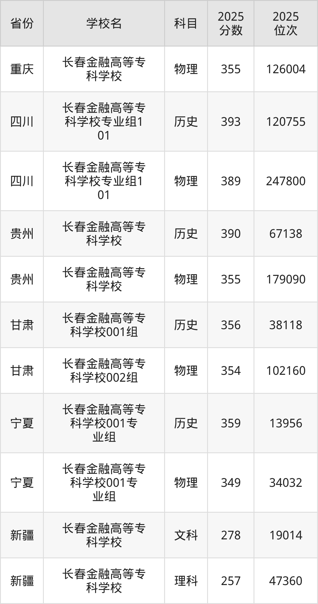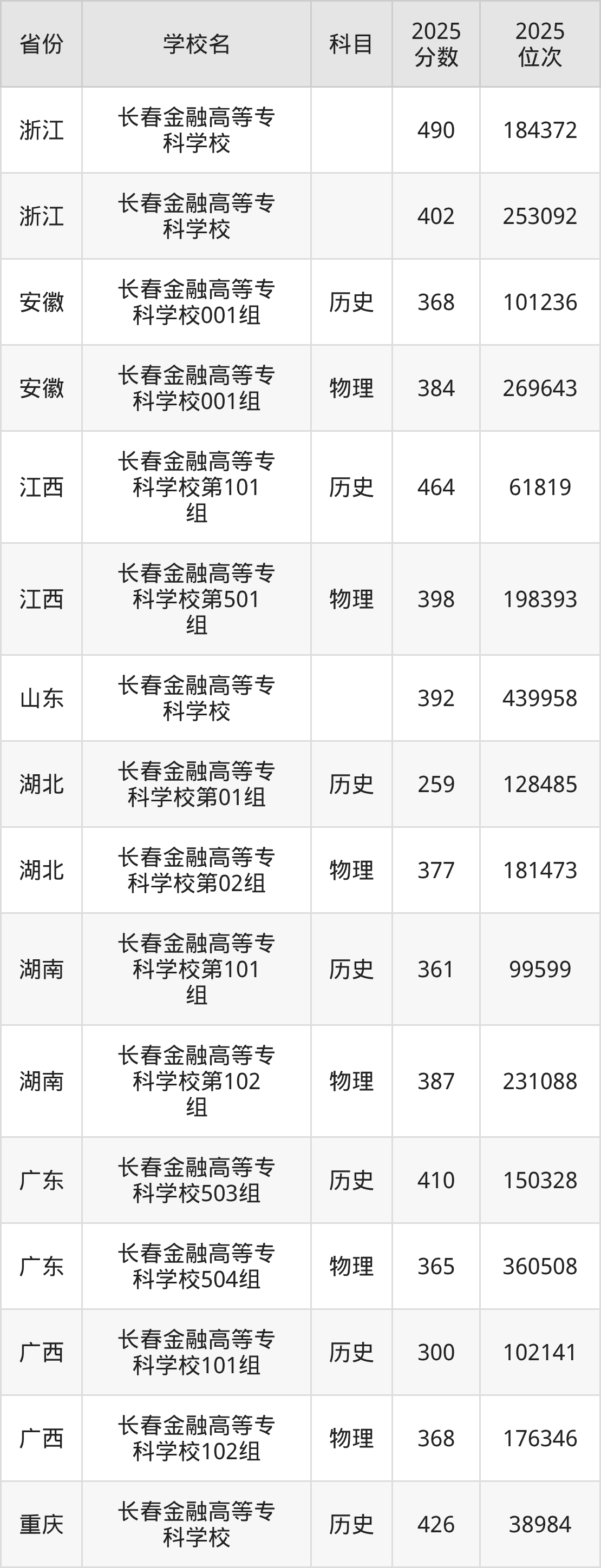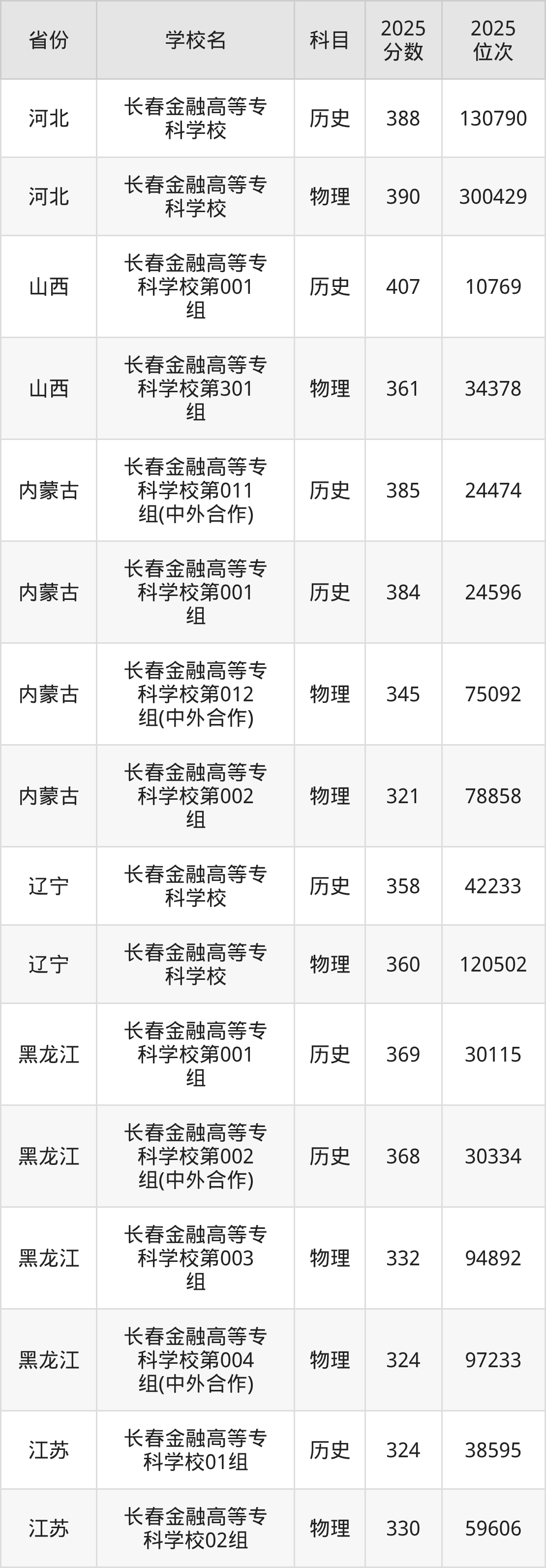 | 长春金融高等专 科学校第001 组 | 历史 | 364 | 23529 |