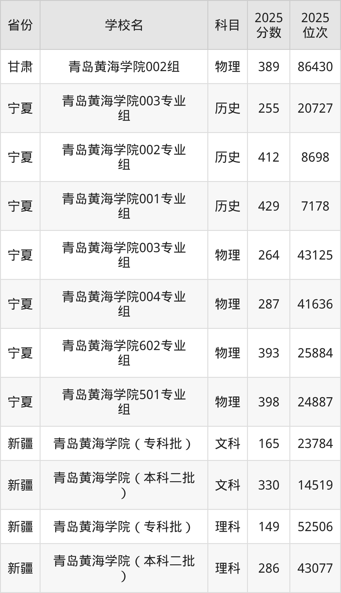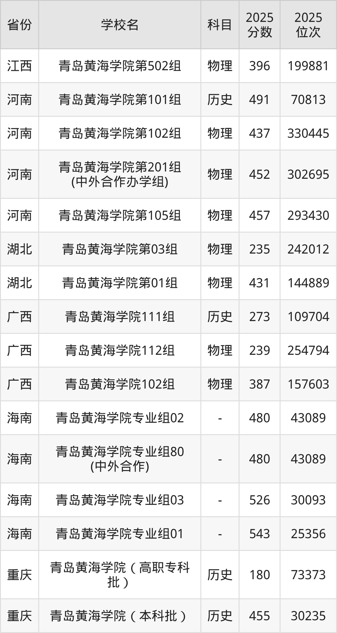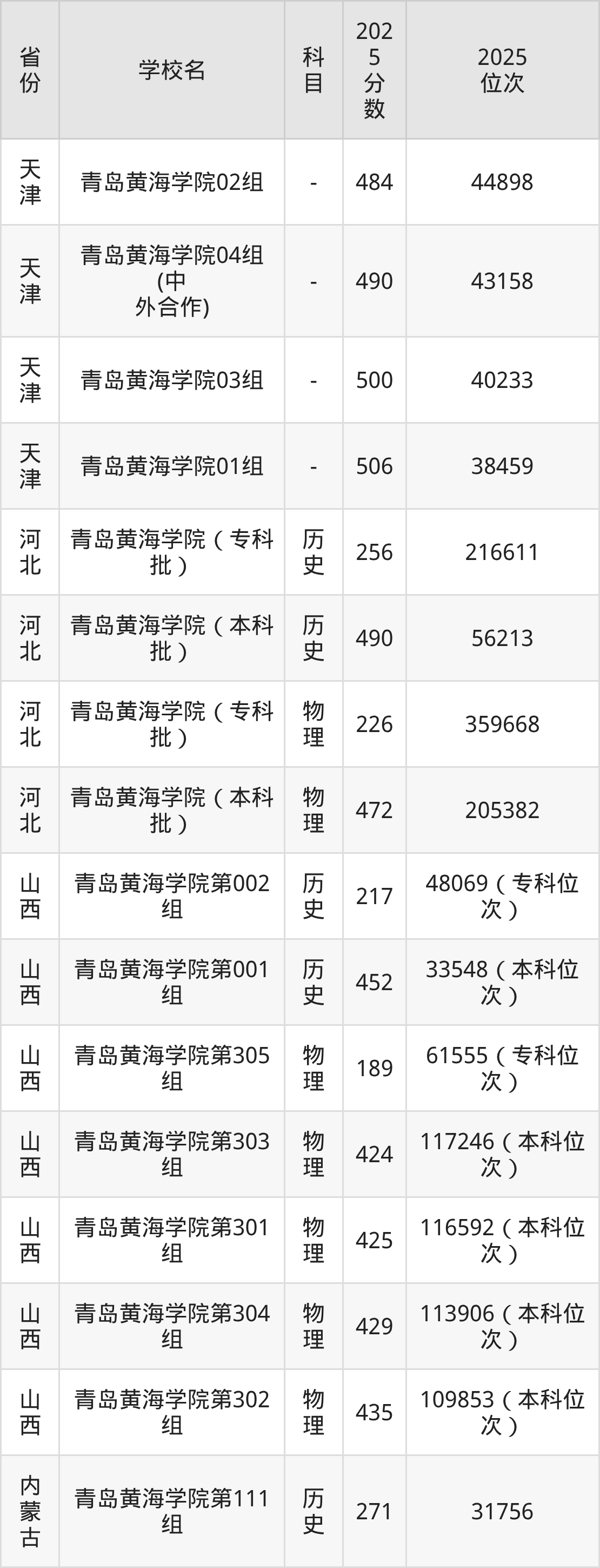 2025年青岛黄海学院在省外录取分数线范围整体位于149分到543分之间,录取分数线最低在新疆理科、录取分数线最高在海南(专业组01)。