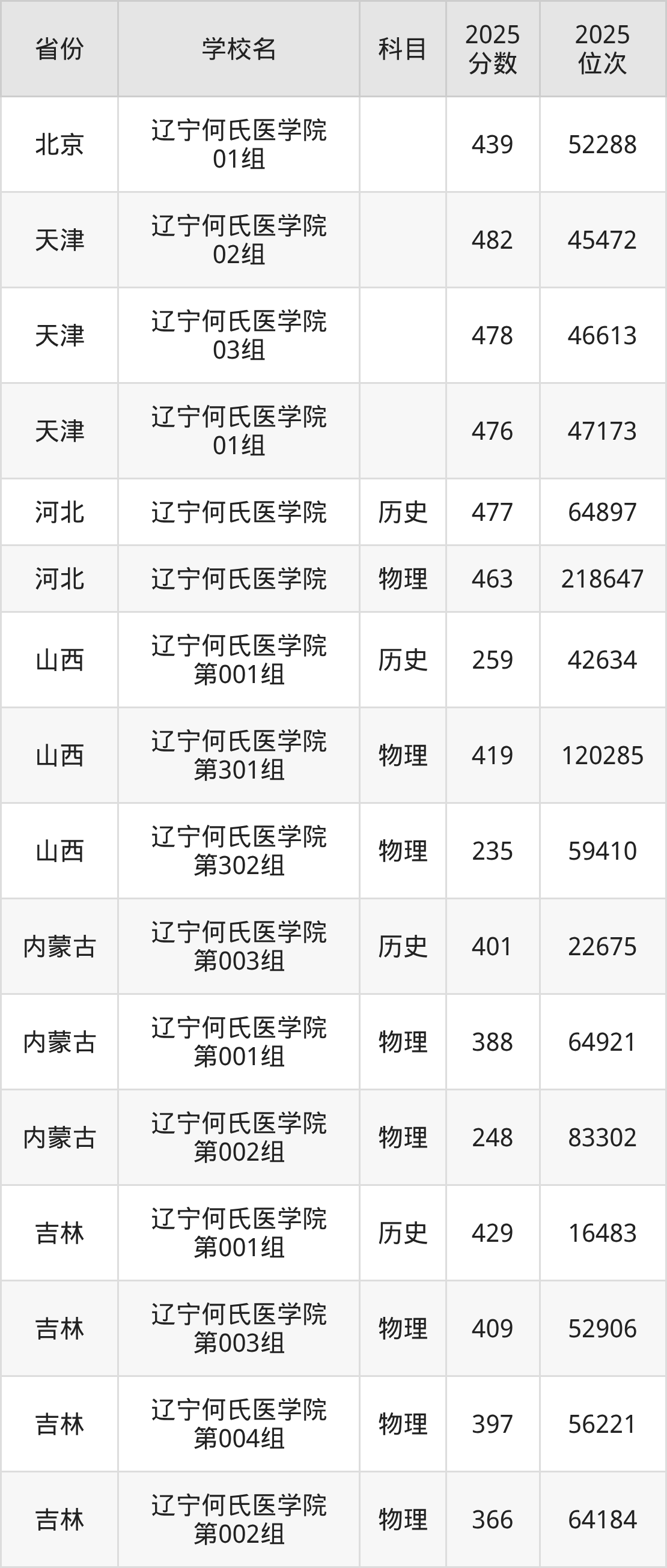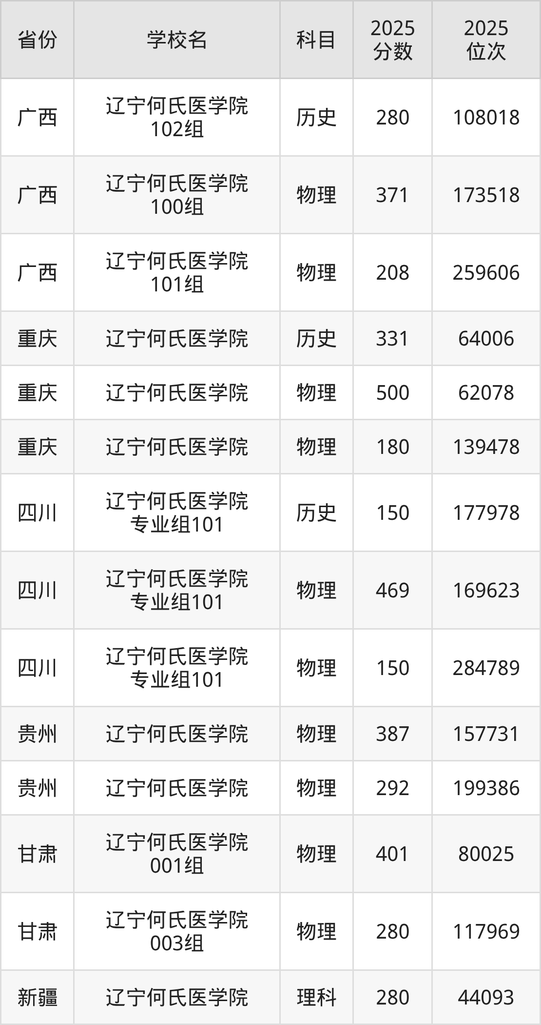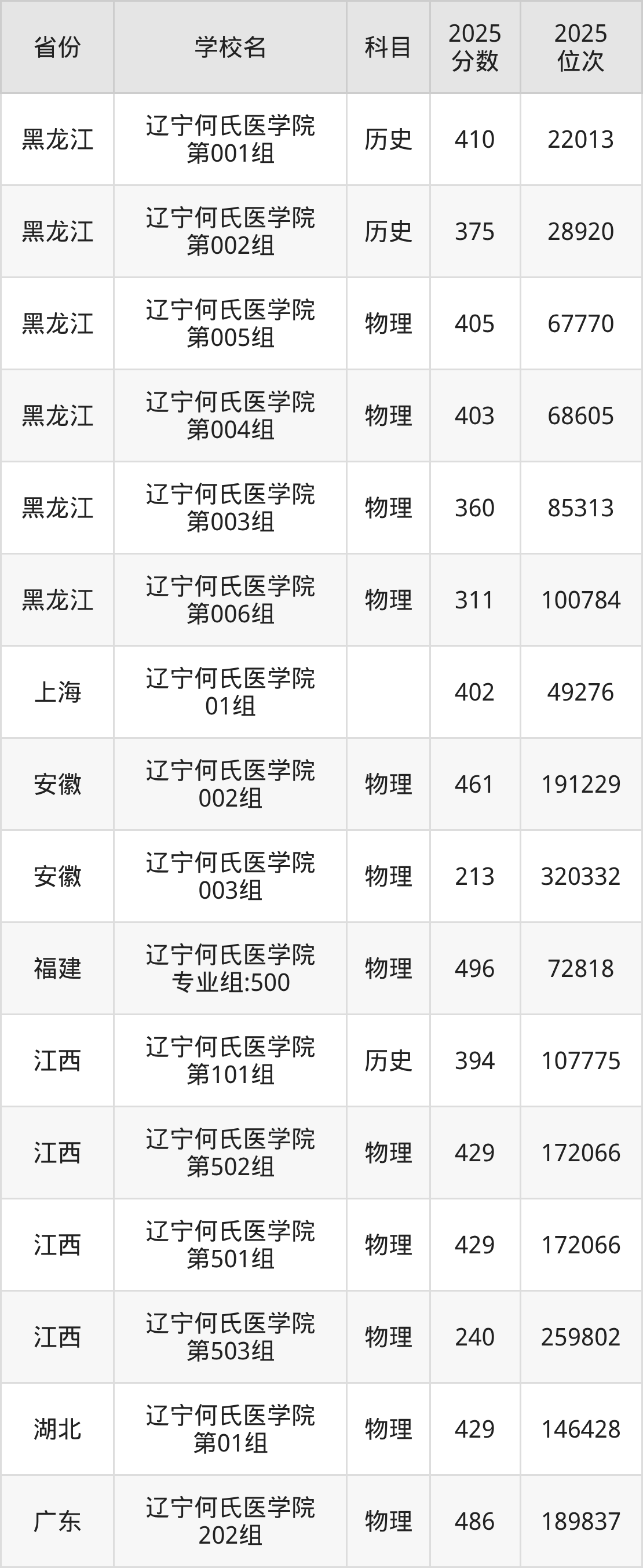 2025年辽宁何氏医学院历史类最低分341分(45111名)、物理类最低分190分(143157名)。