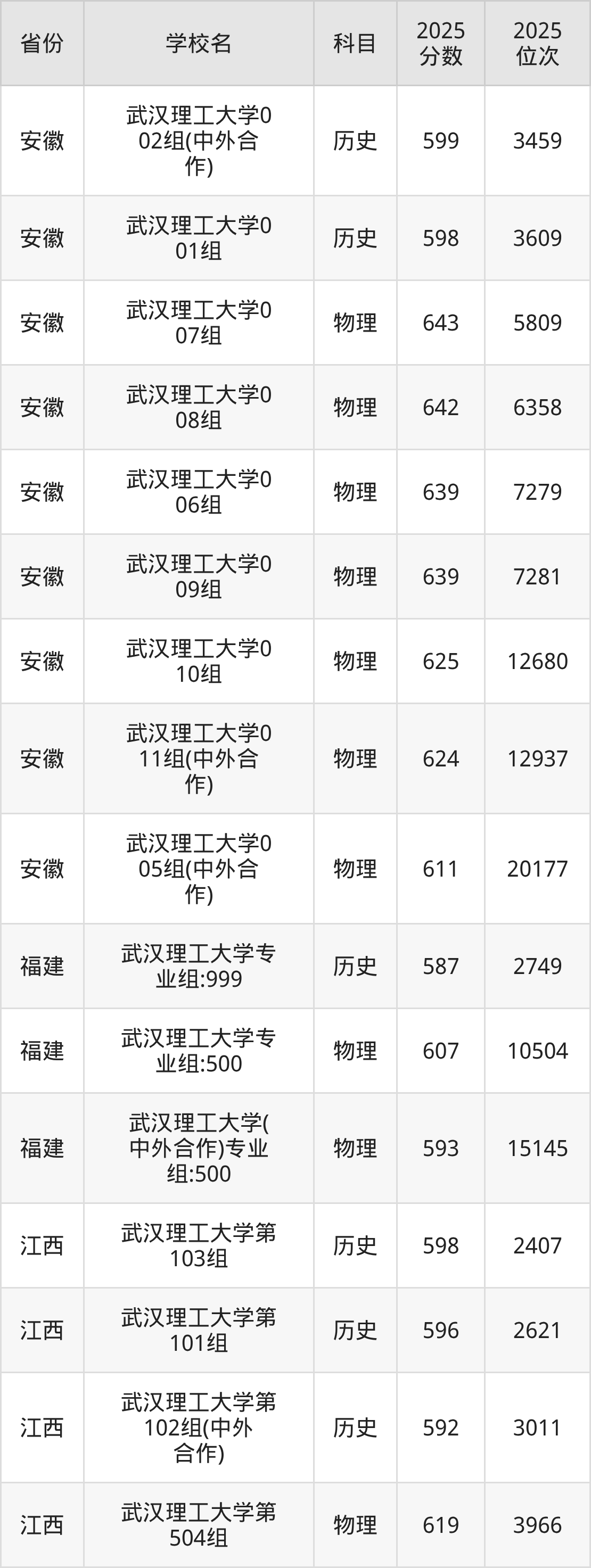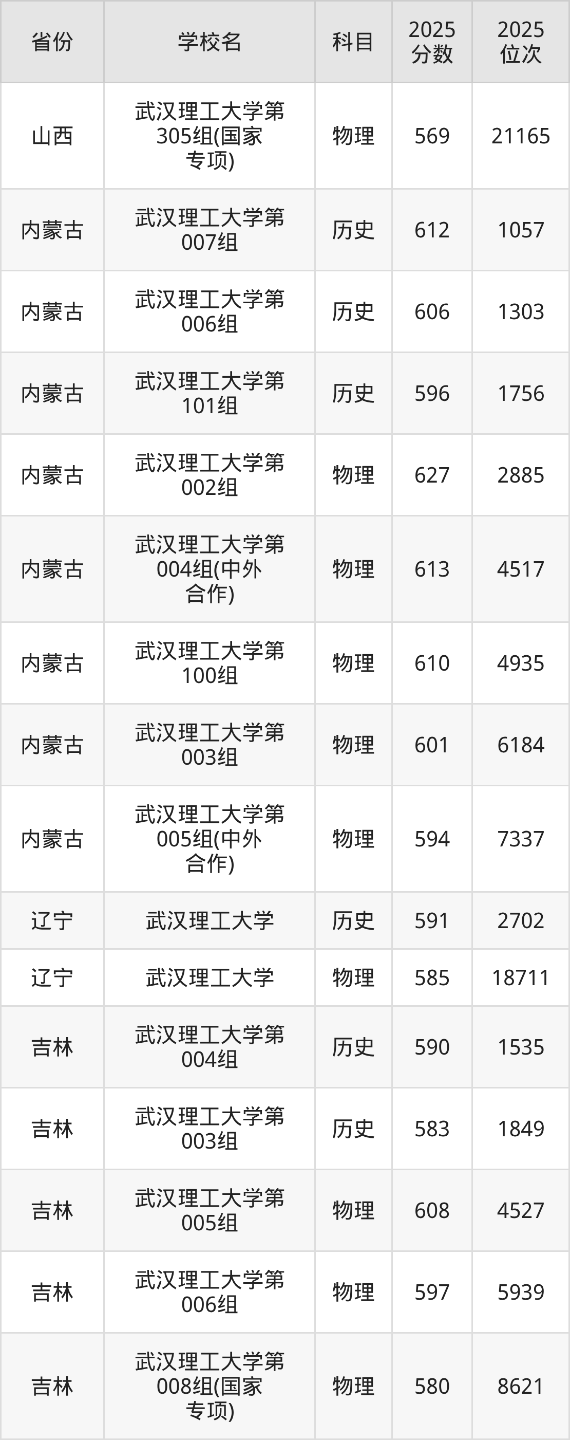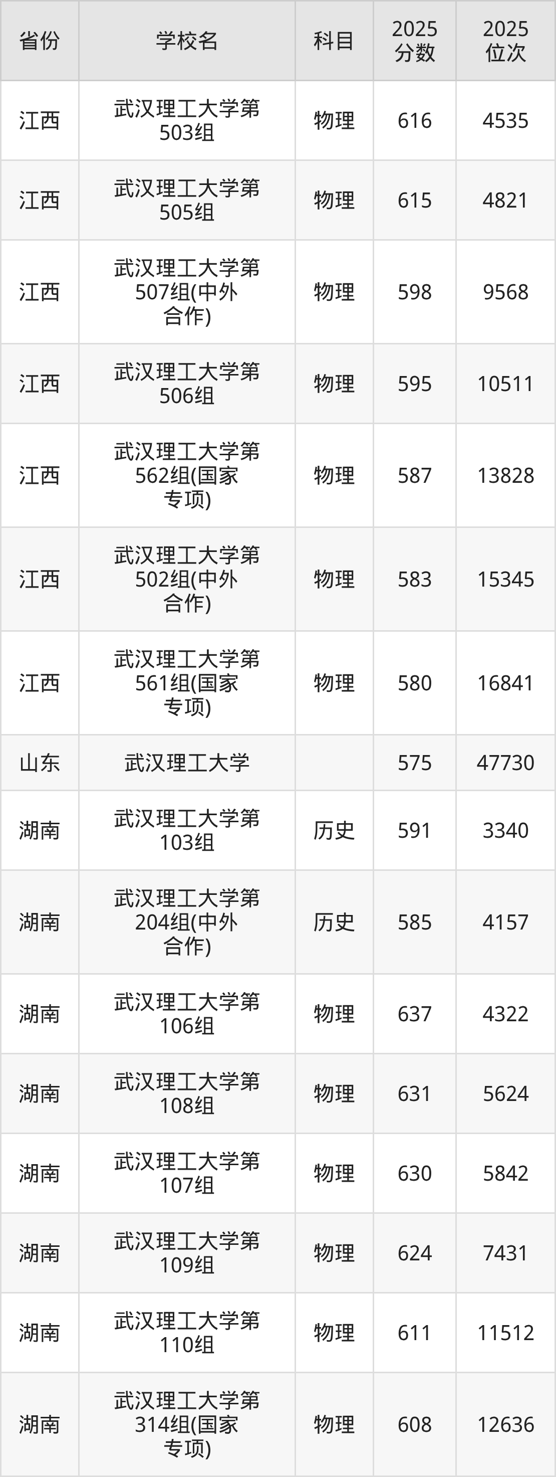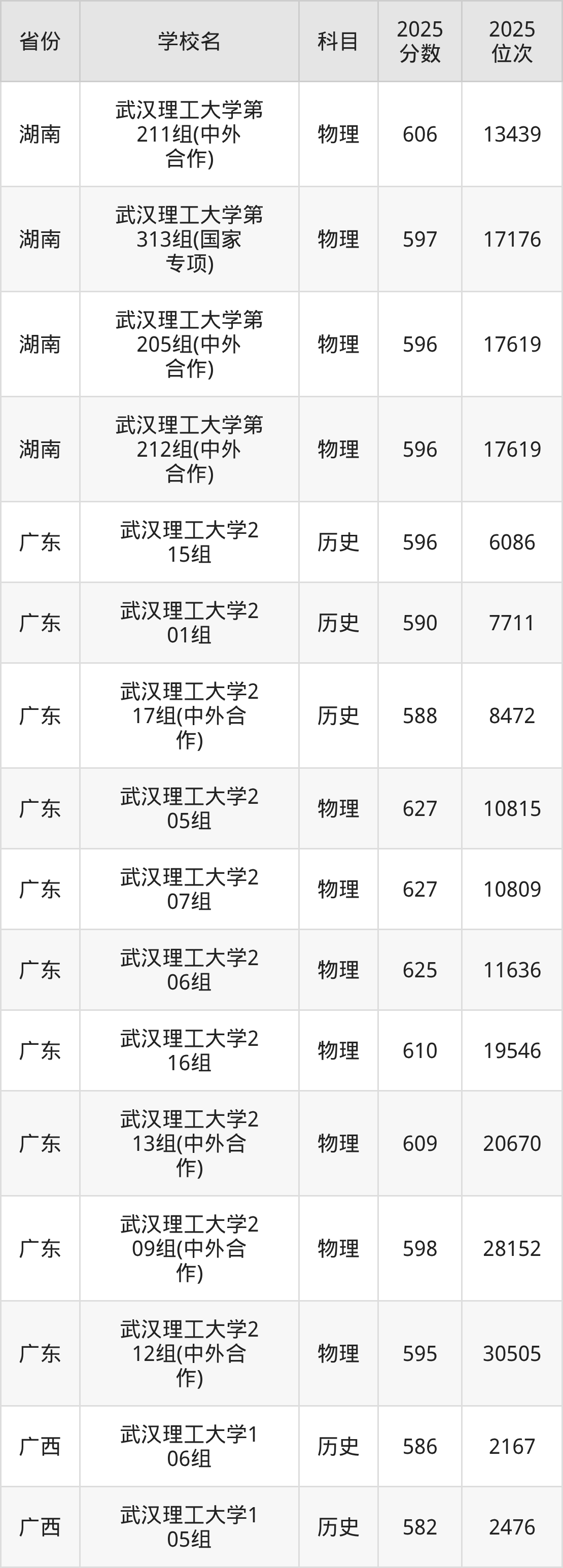 2025年武汉理工大学在省内分历史物理科目类录取,其中历史类最低分是588分、对应位次是5034名;物理类最低分是583分,对应位次是22609名。