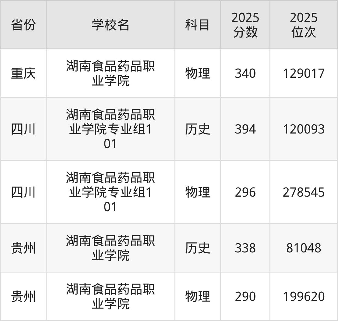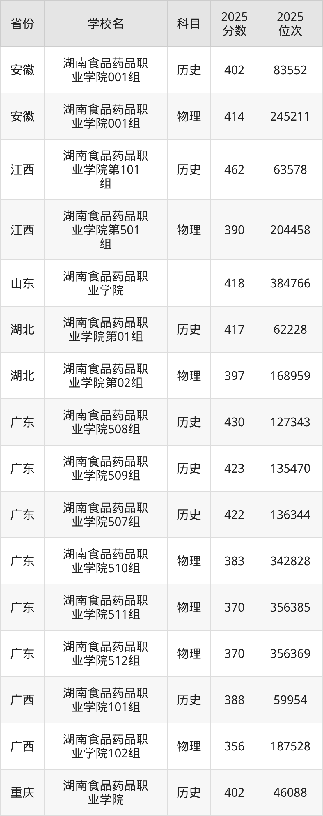 2025年湖南食品药品职业学院历史类最低分376分(91721名)、物理类最低分357分(258644名)。
