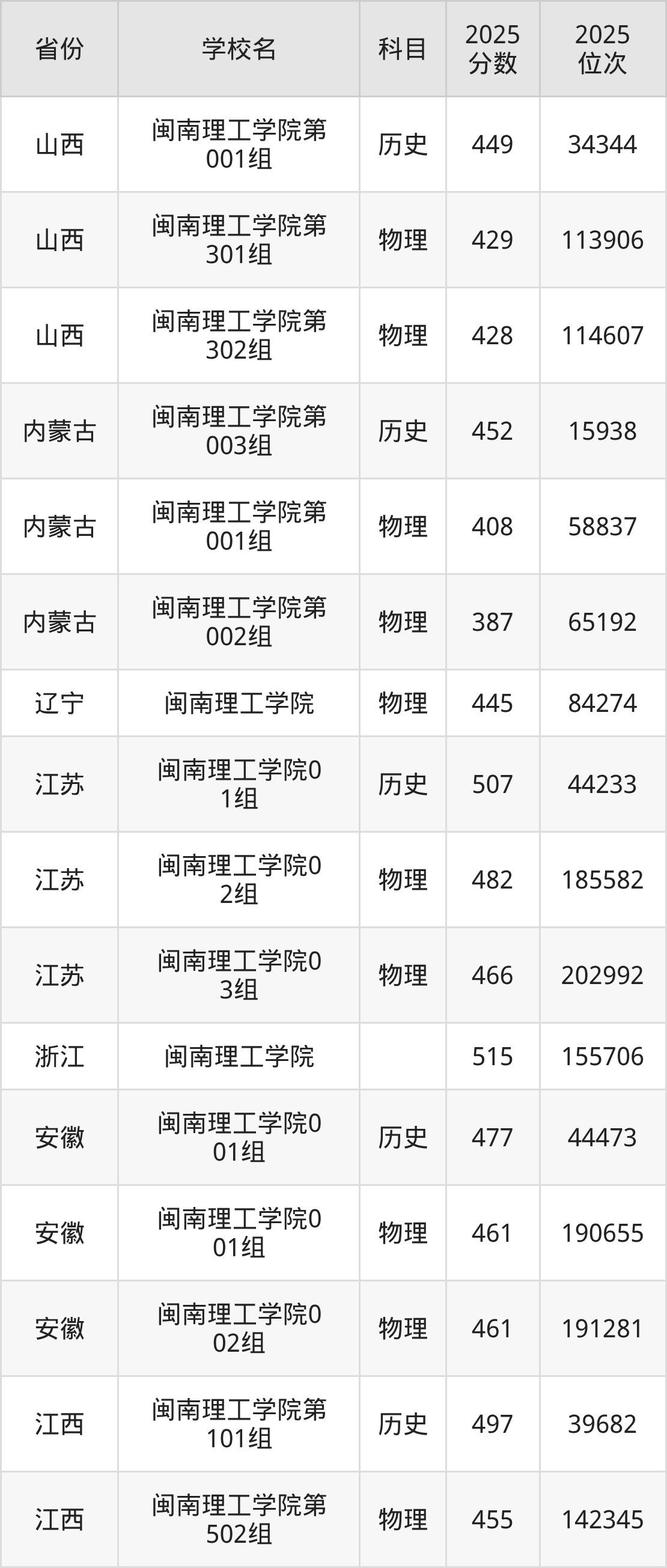 2025年闽南理工学院历史类最低分452分(25117名)、物理类最低分443分(117511名)。