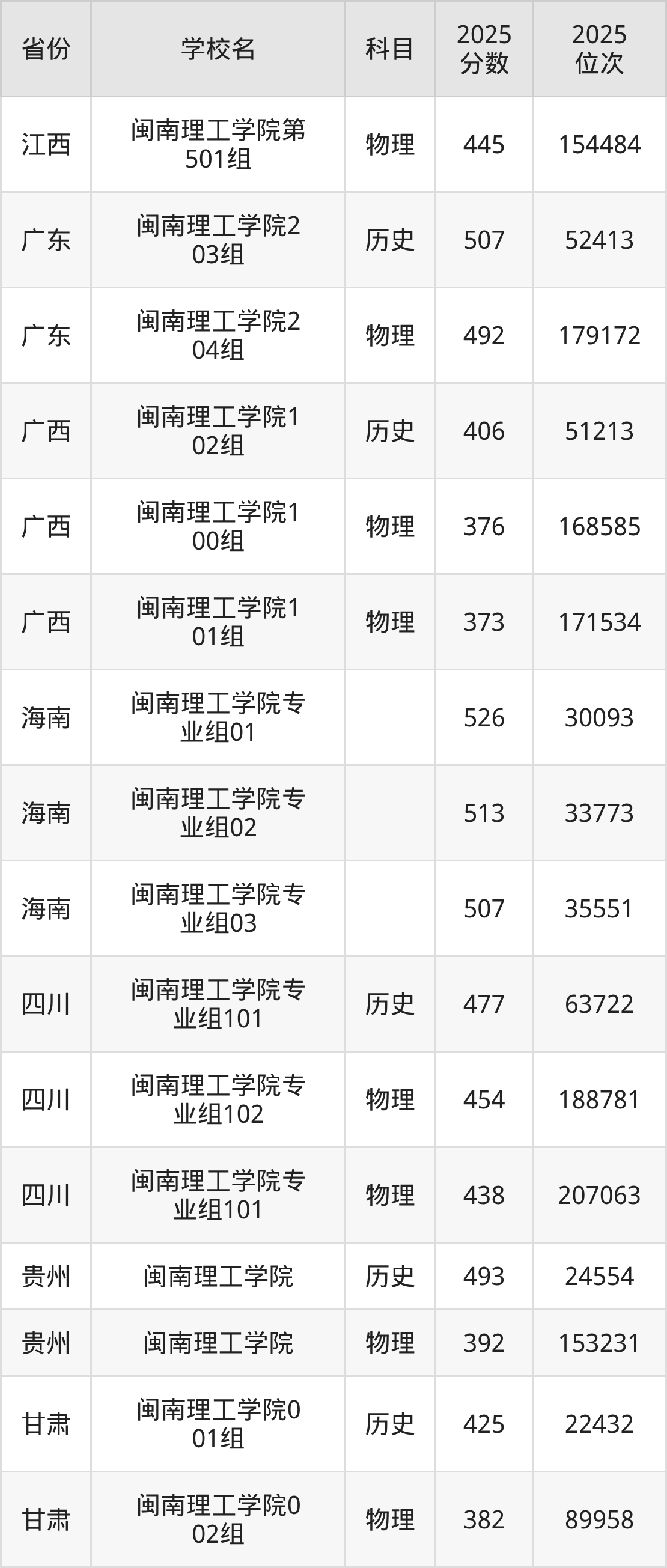 2025年闽南理工学院在省内分历史物理科目类录取,其中历史类最低分是452分、对应位次是25117名;物理类最低分是443分,对应位次是117511名。