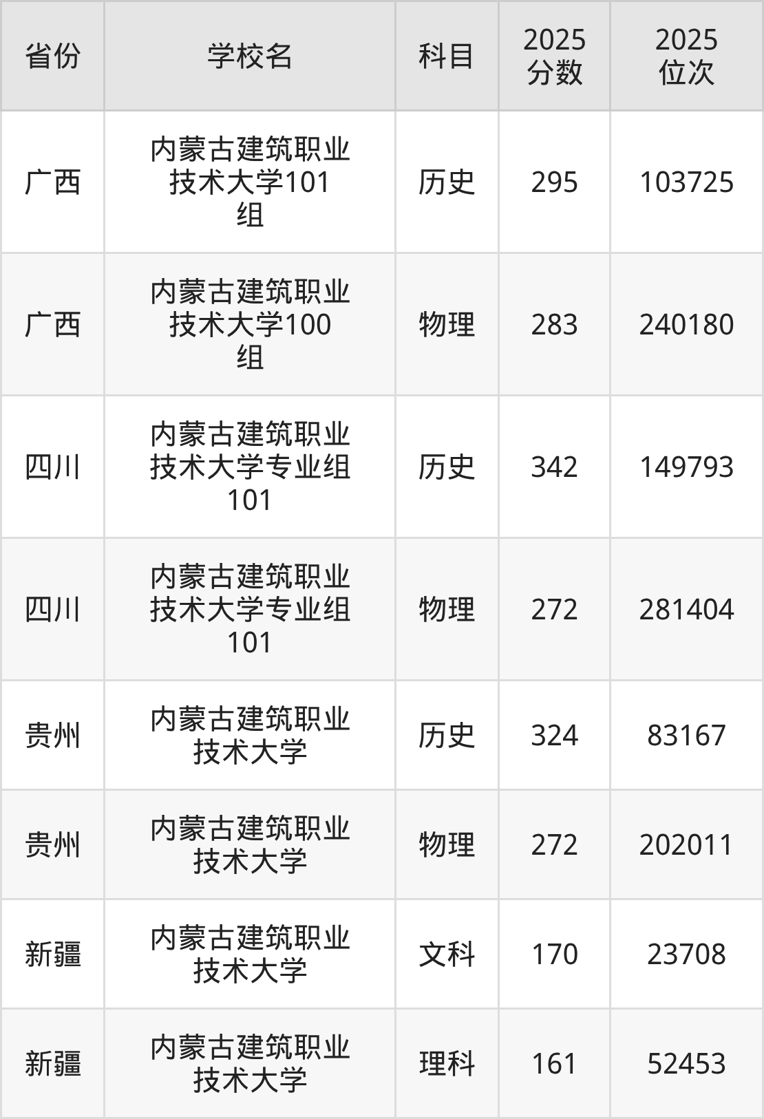 2025年内蒙古建筑职业技术大学在自治区外录取分数线范围整体位于161分到342分之间,录取分数线最低在新疆理科、录取分数线最高在四川历史(专业组101)。