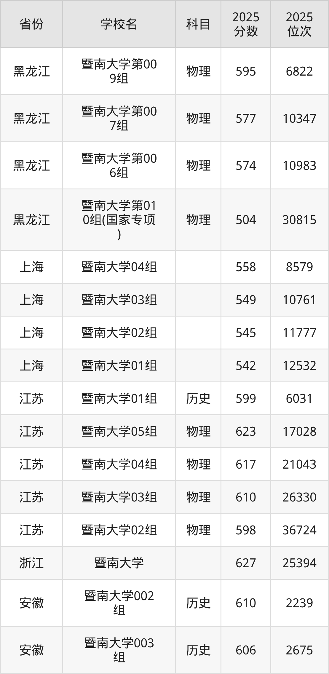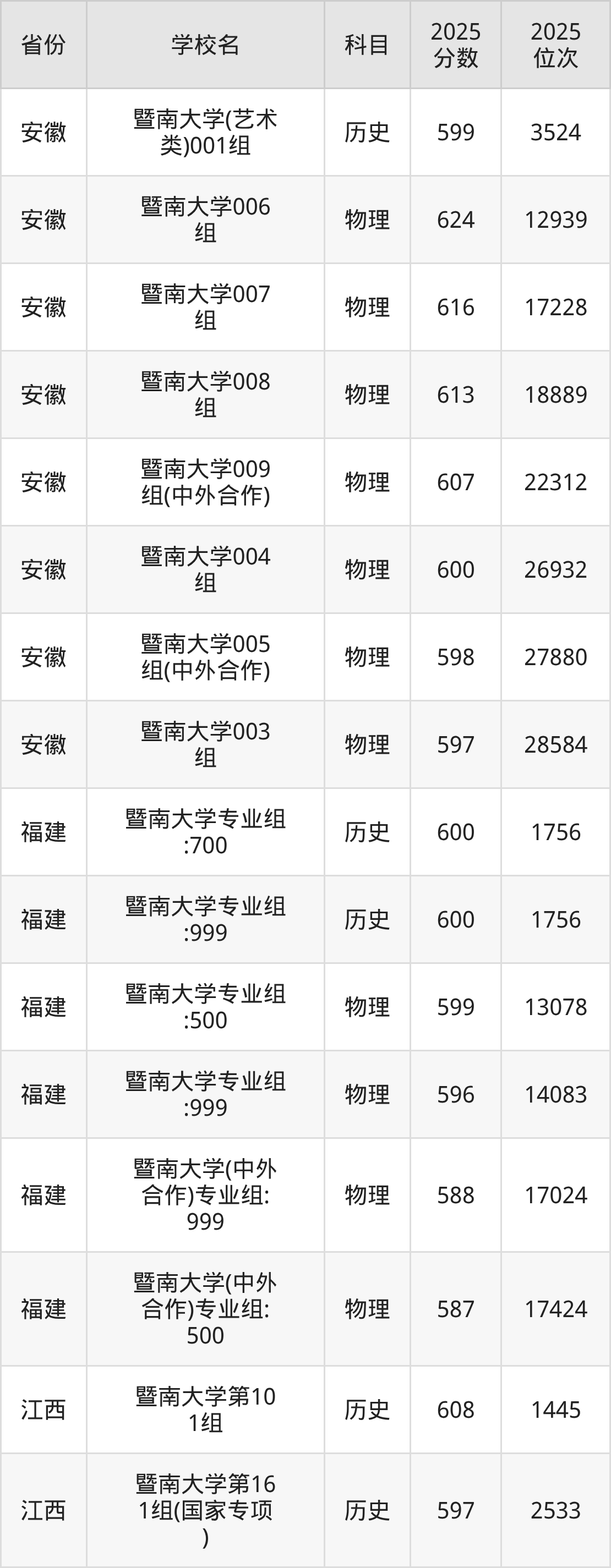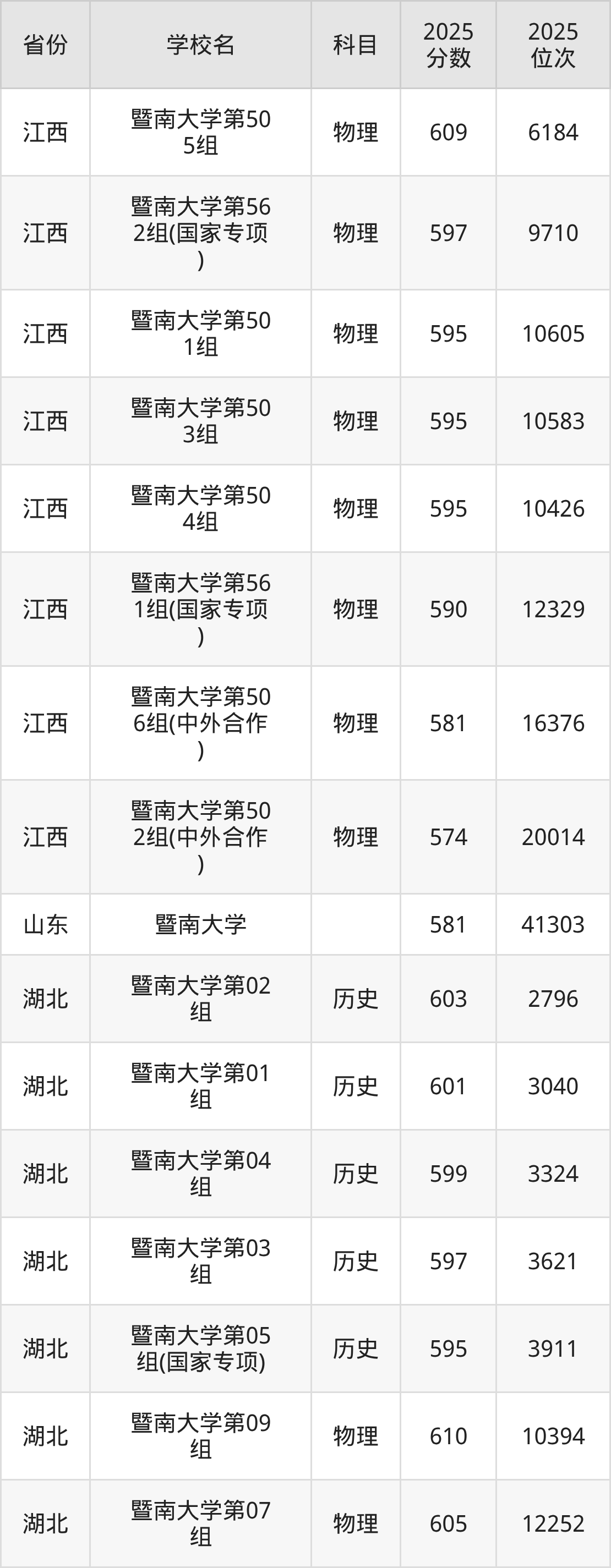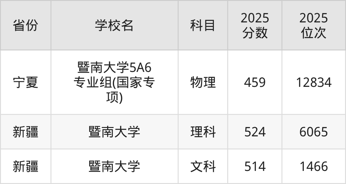 2025年暨南大学在省内分历史物理科目类录取,其中历史类最低分是598分、对应位次是5524名;物理类最低分是591分,对应位次是34231名。