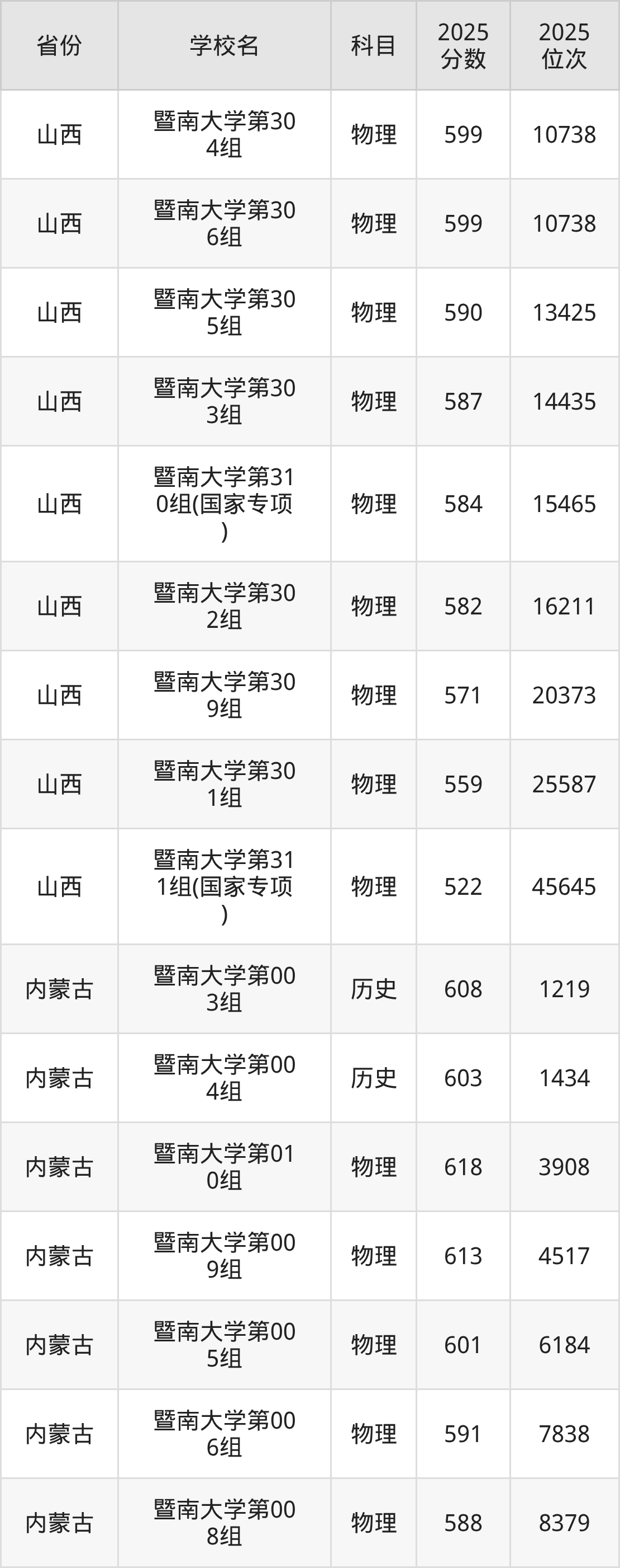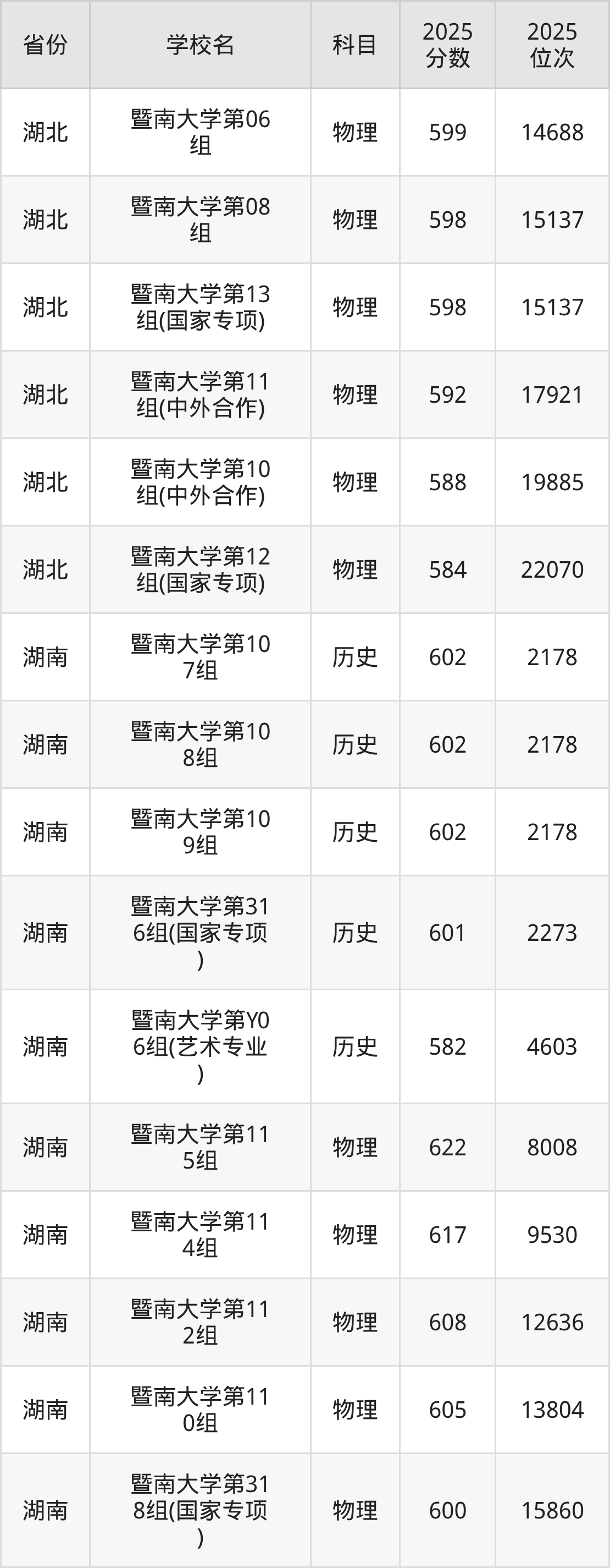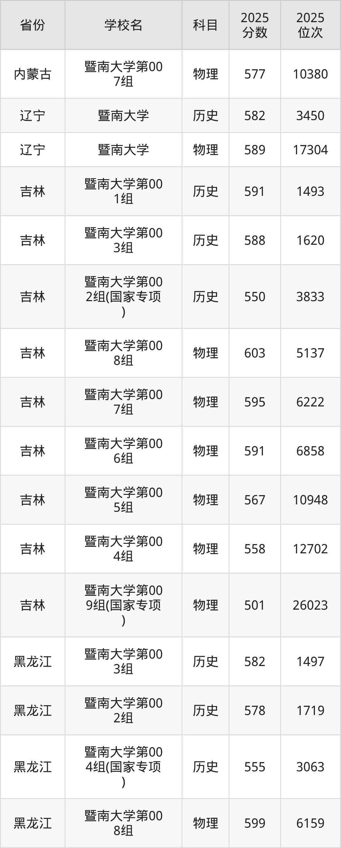 2025年暨南大学在省内分历史物理科目类录取,其中历史类最低分是598分、对应位次是5524名;物理类最低分是591分,对应位次是34231名。