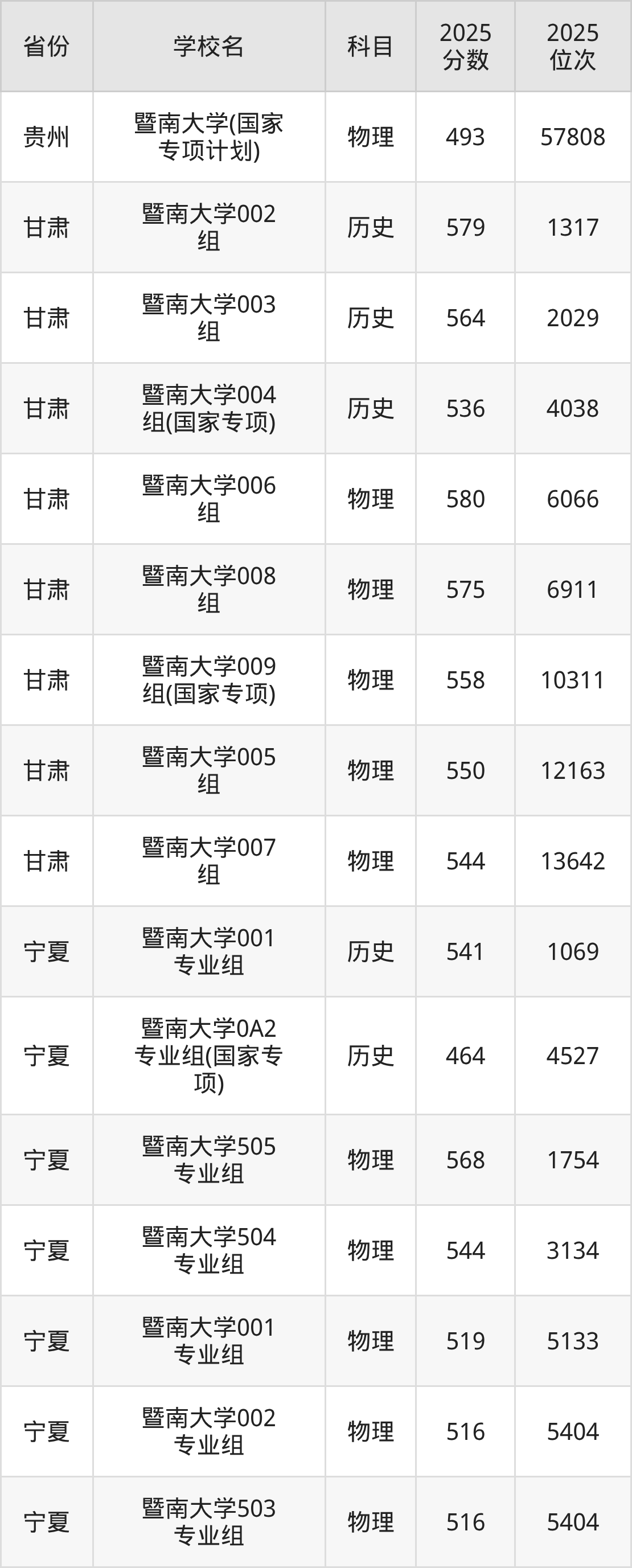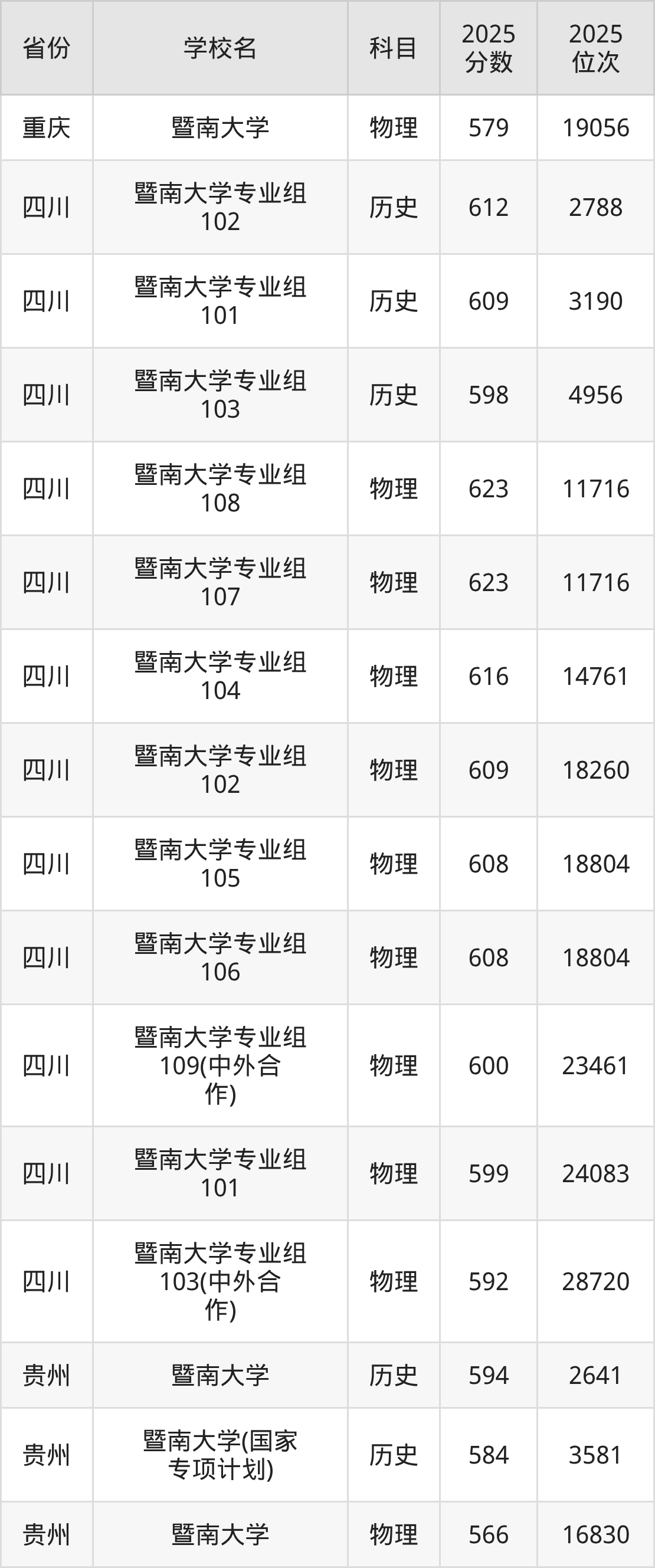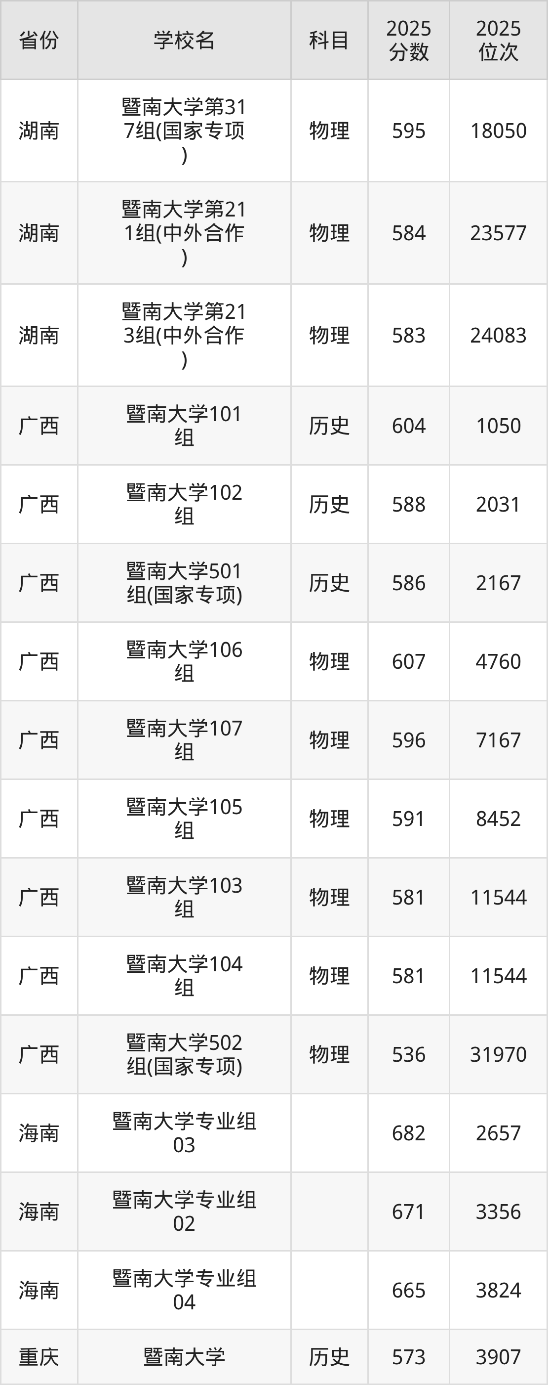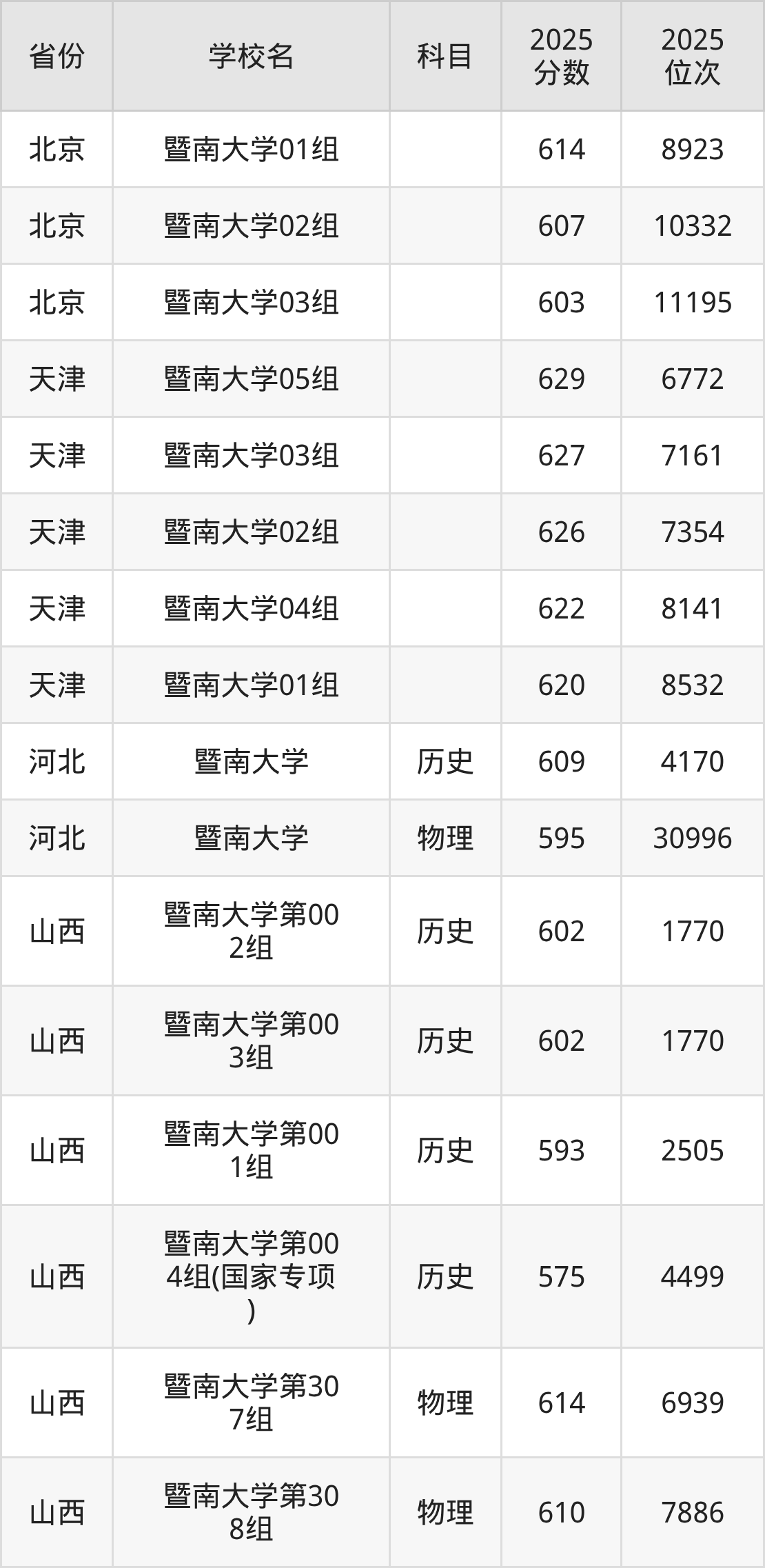 2025年暨南大学在省内分历史物理科目类录取,其中历史类最低分是598分、对应位次是5524名;物理类最低分是591分,对应位次是34231名。