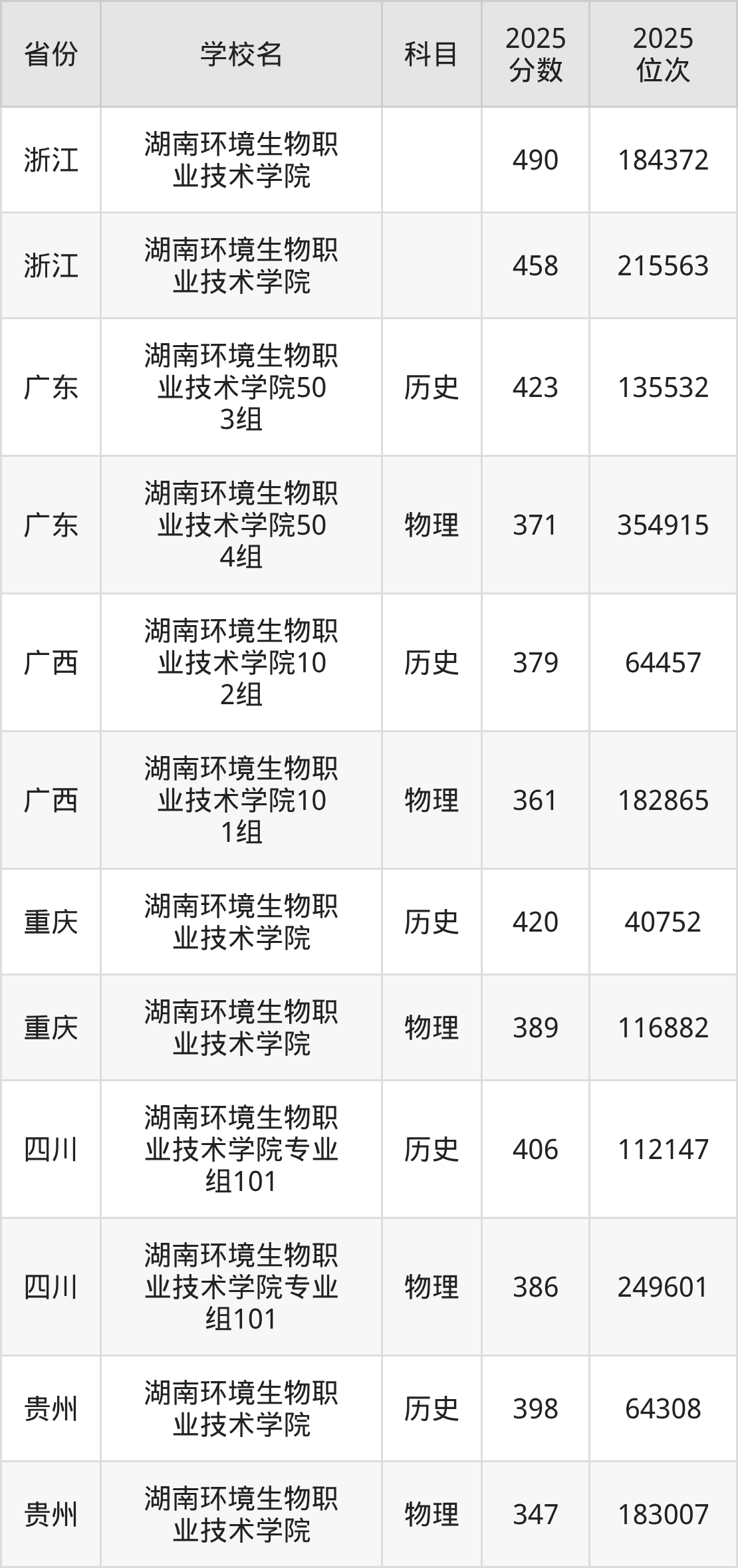 2025年湖南环境生物职业技术学院历史类最低分382分(88467名)、物理类最低分355分(260311名)。