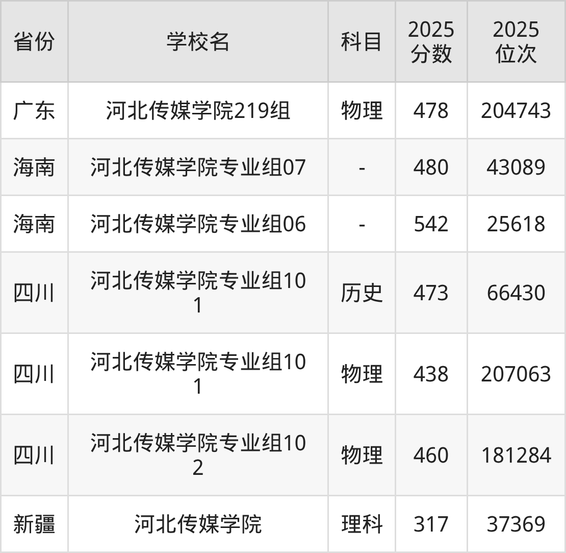 2025年河北传媒学院在省内,其中历史类最低分是477分、对应位次是64897名;物理类最低分是459分,对应位次是224230名。
