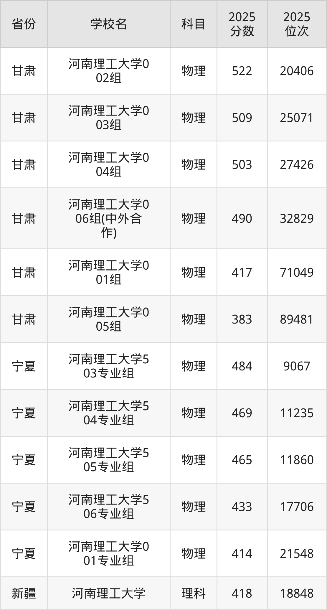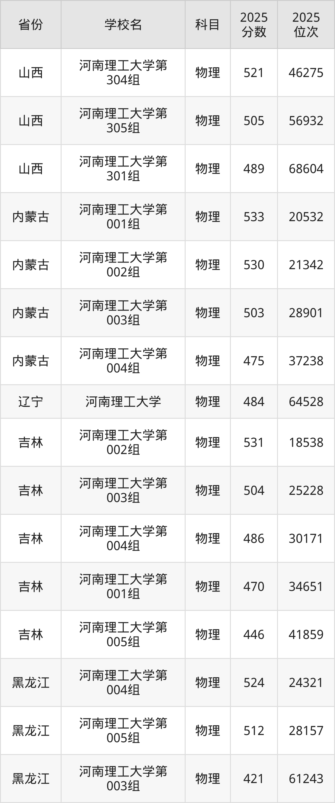 2025年河南理工大学在省外录取分数线范围整体位于383分到605分之间,录取分数线最低在甘肃物理(005组)、录取分数线最高在海南(专业组03)。