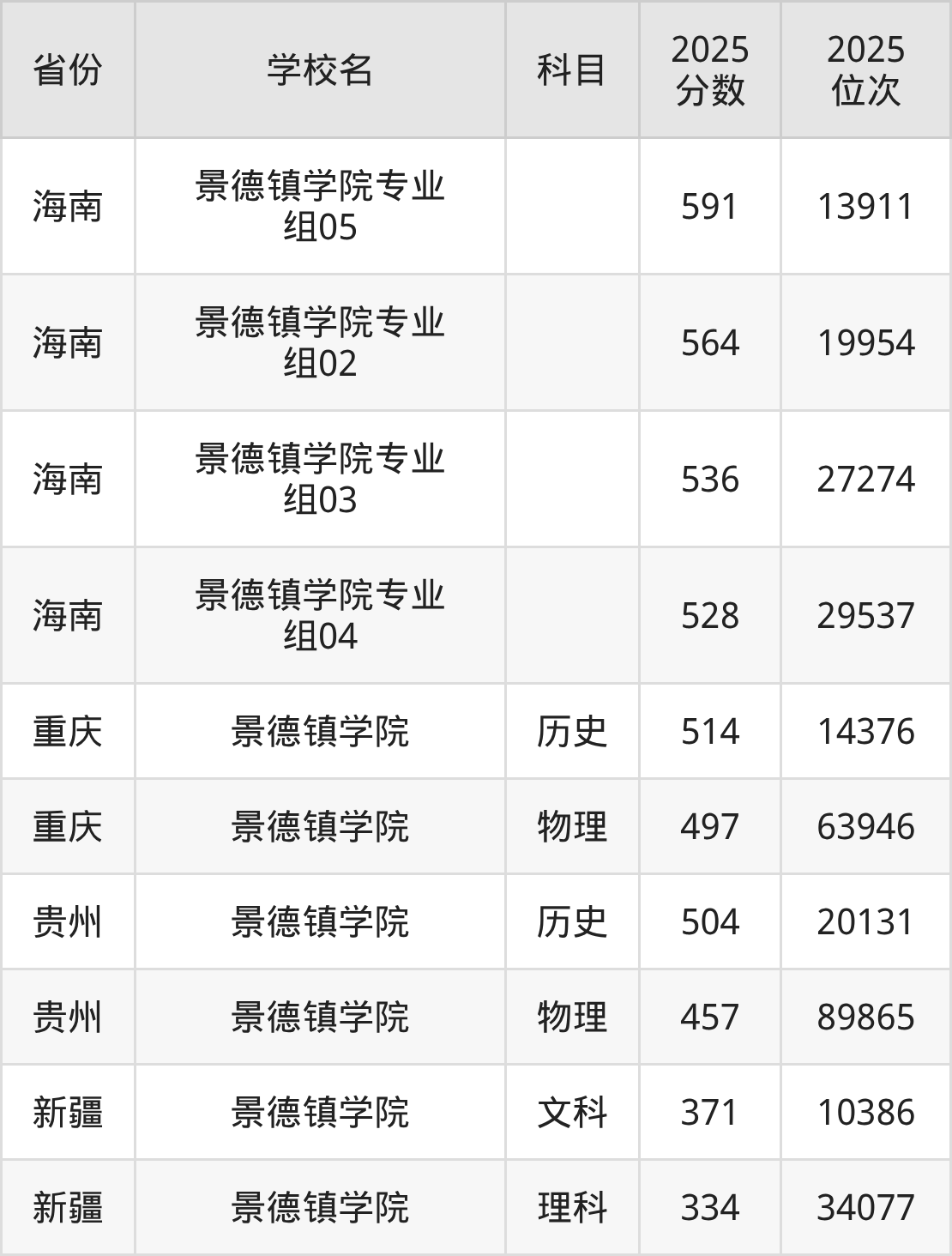 2025年景德镇学院在省外录取分数线范围整体位于334分到591分之间,录取分数线最低在新疆理科、录取分数线最高在海南(专业组05)。