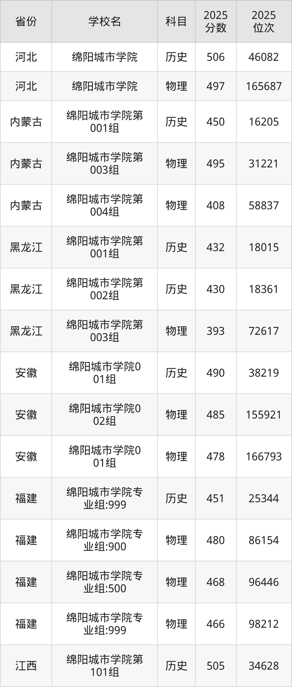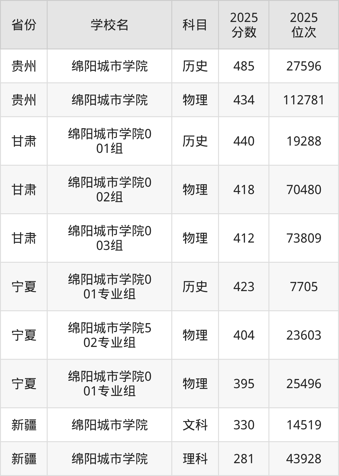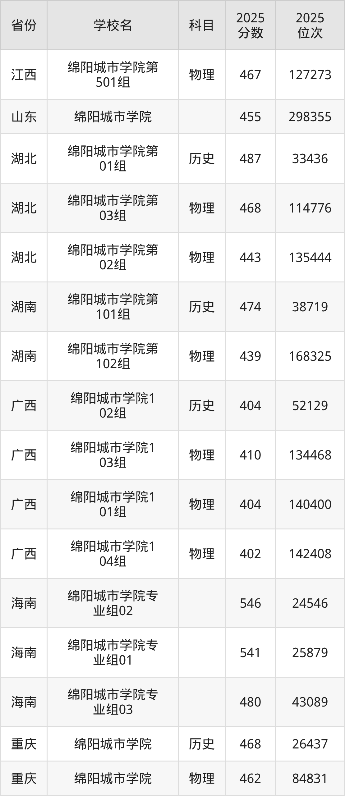 下面是绵阳城市学院2025年录取分数线各省汇总,一起来了解下吧。