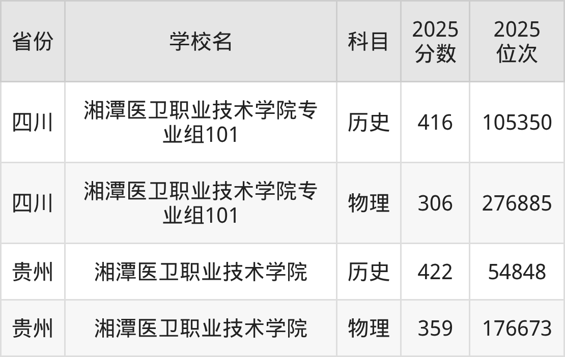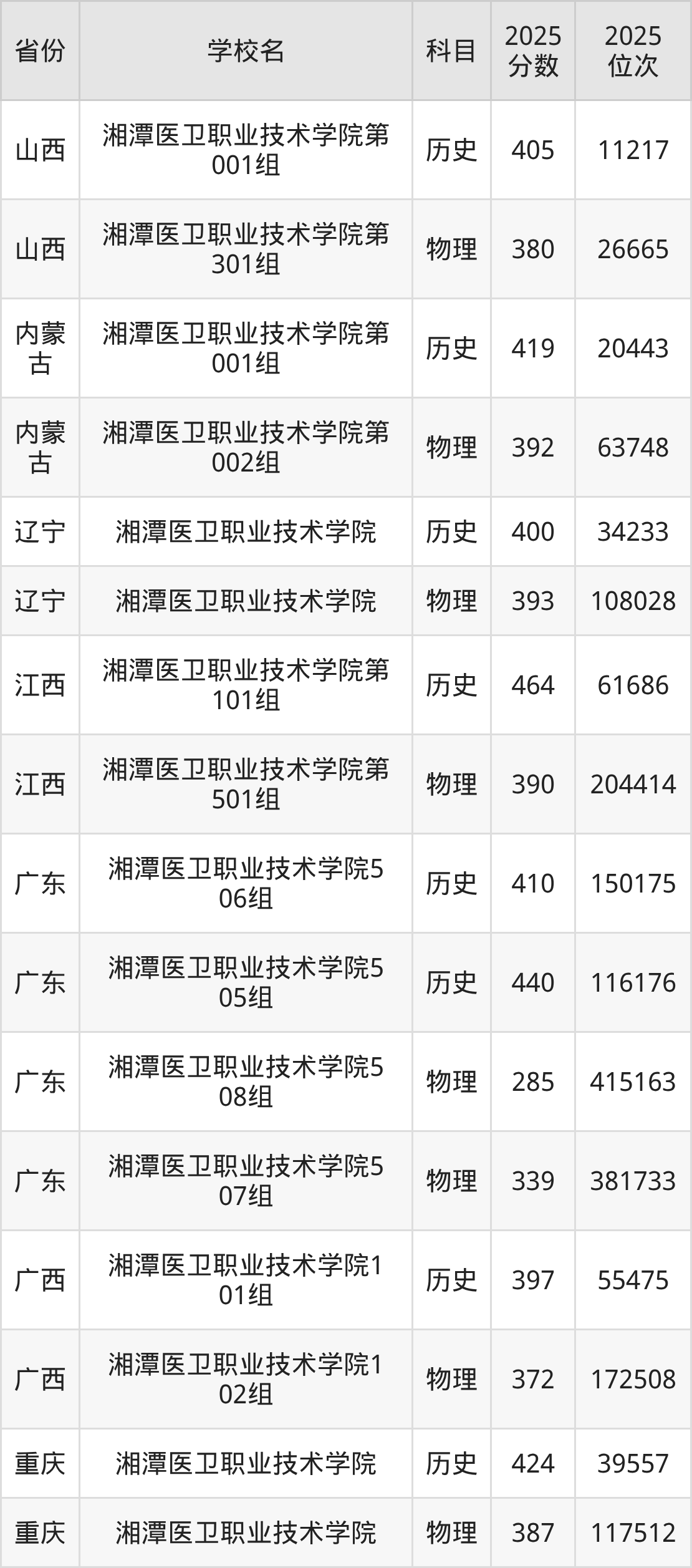 2025年湘潭医卫职业技术学院历史类最低分417分(68870名)、物理类最低分386分(232052名)。