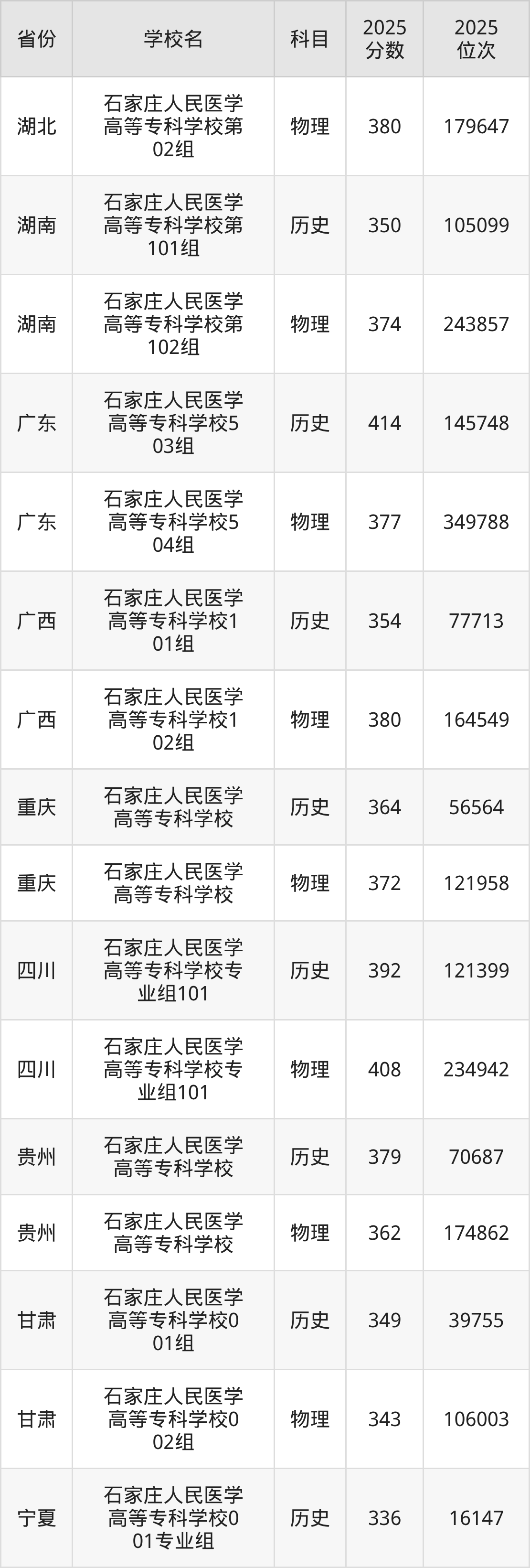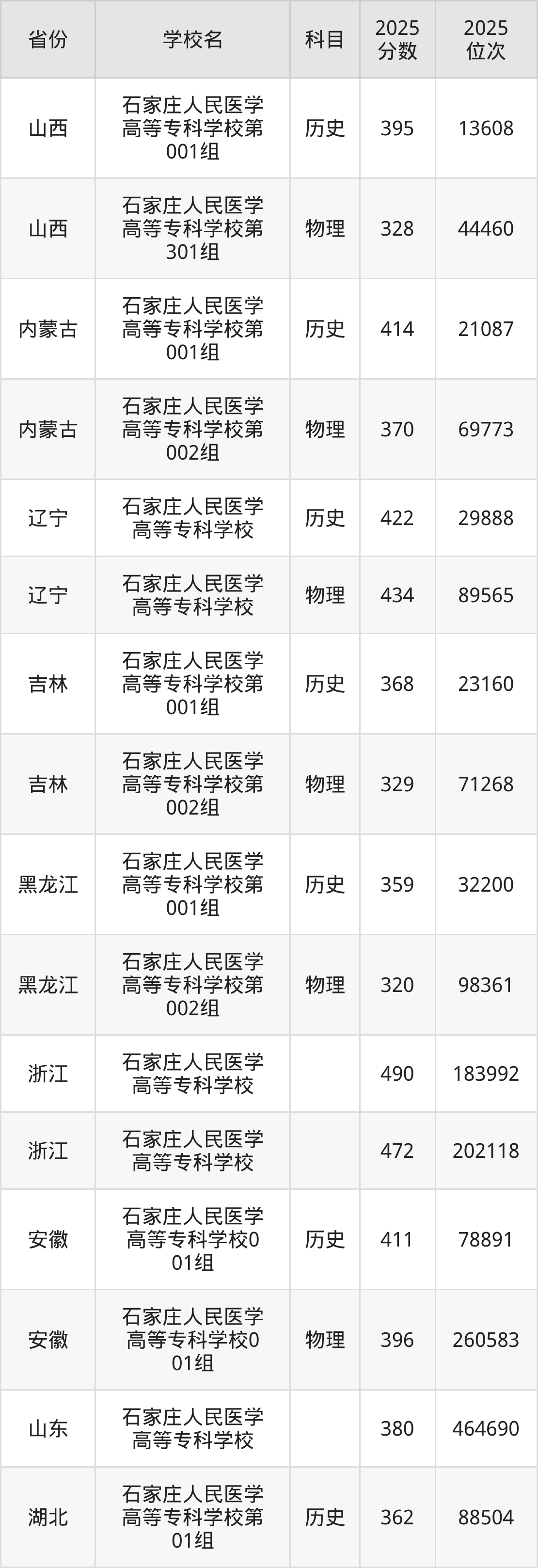 | 石家庄人民医学 高等专科学校 | 物理 | 250 | 356767 |
