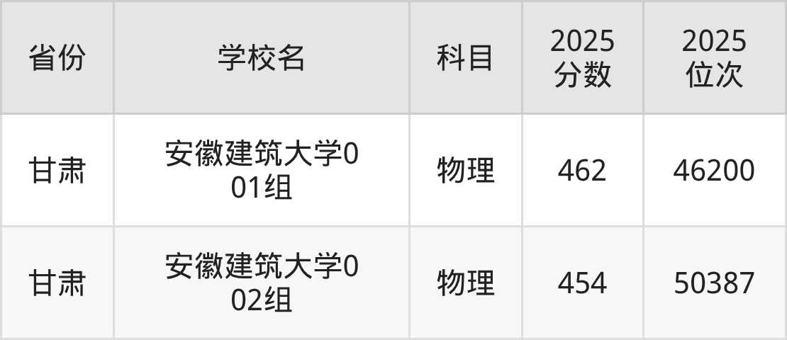 | 安徽建筑大学0 10组 | 物理 | 570 | 50056 |
