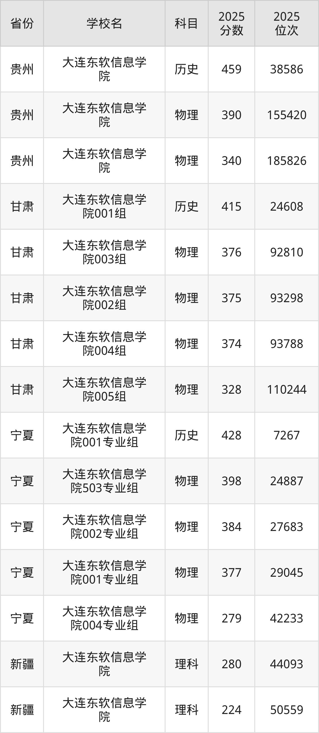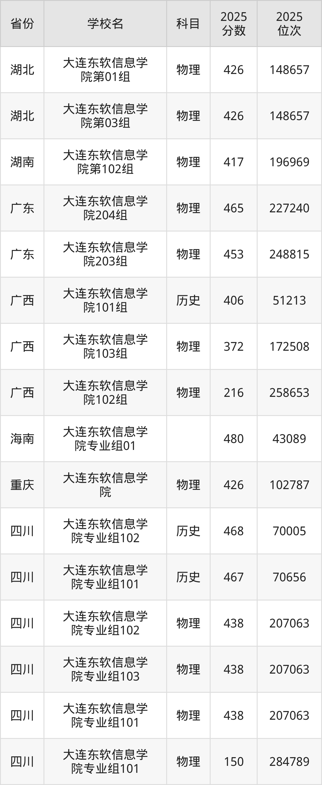 2025年大连东软信息学院在省内分历史物理科目类录取,其中历史类最低分是351分、对应位次是43423名;物理类最低分是170分,对应位次是143300名。