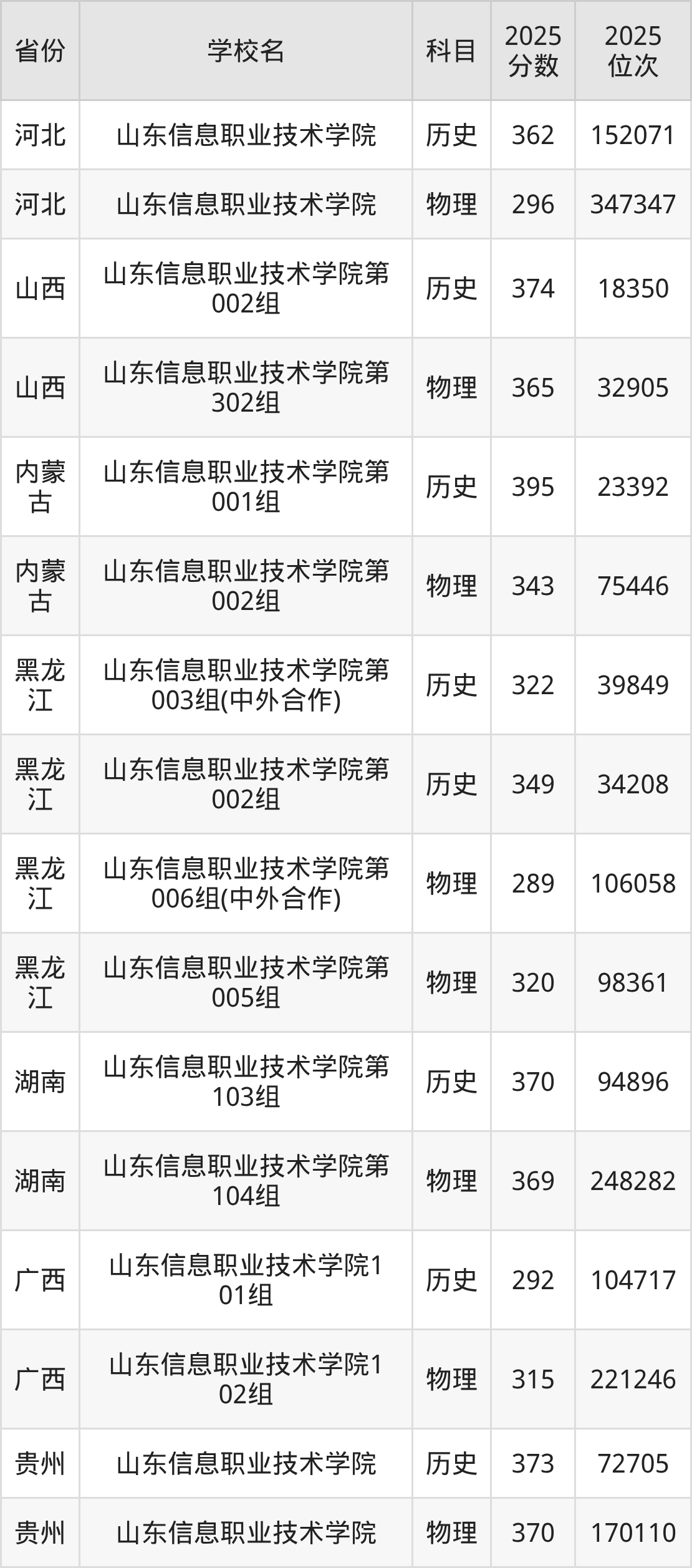 2025年山东信息职业技术学院在省外录取分数线范围整体位于289分到395分之间,录取分数线最低在黑龙江物理(第006组(中外合作))、录取分数线最高在内蒙古历史(第001组)。