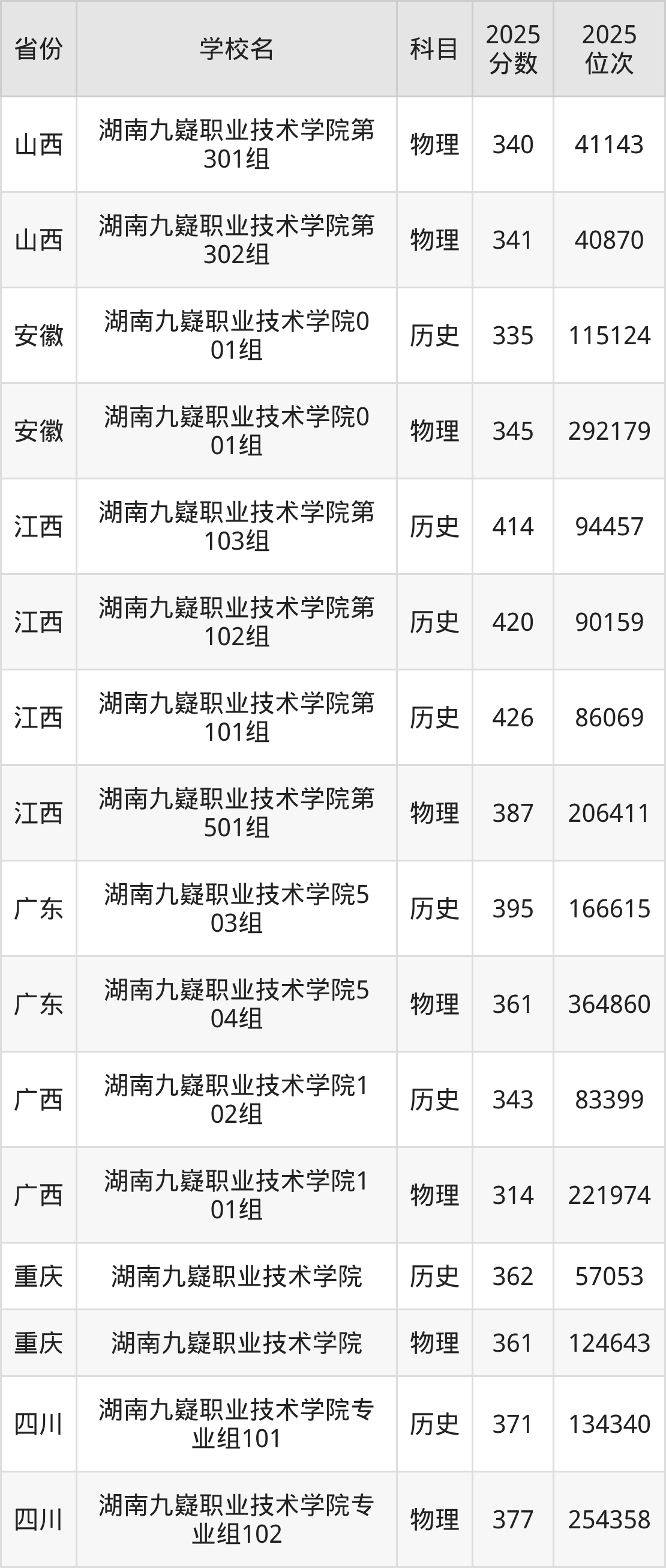 2025年湖南九嶷职业技术学院历史类最低分338分(110636名)、物理类最低分343分(269215名)。