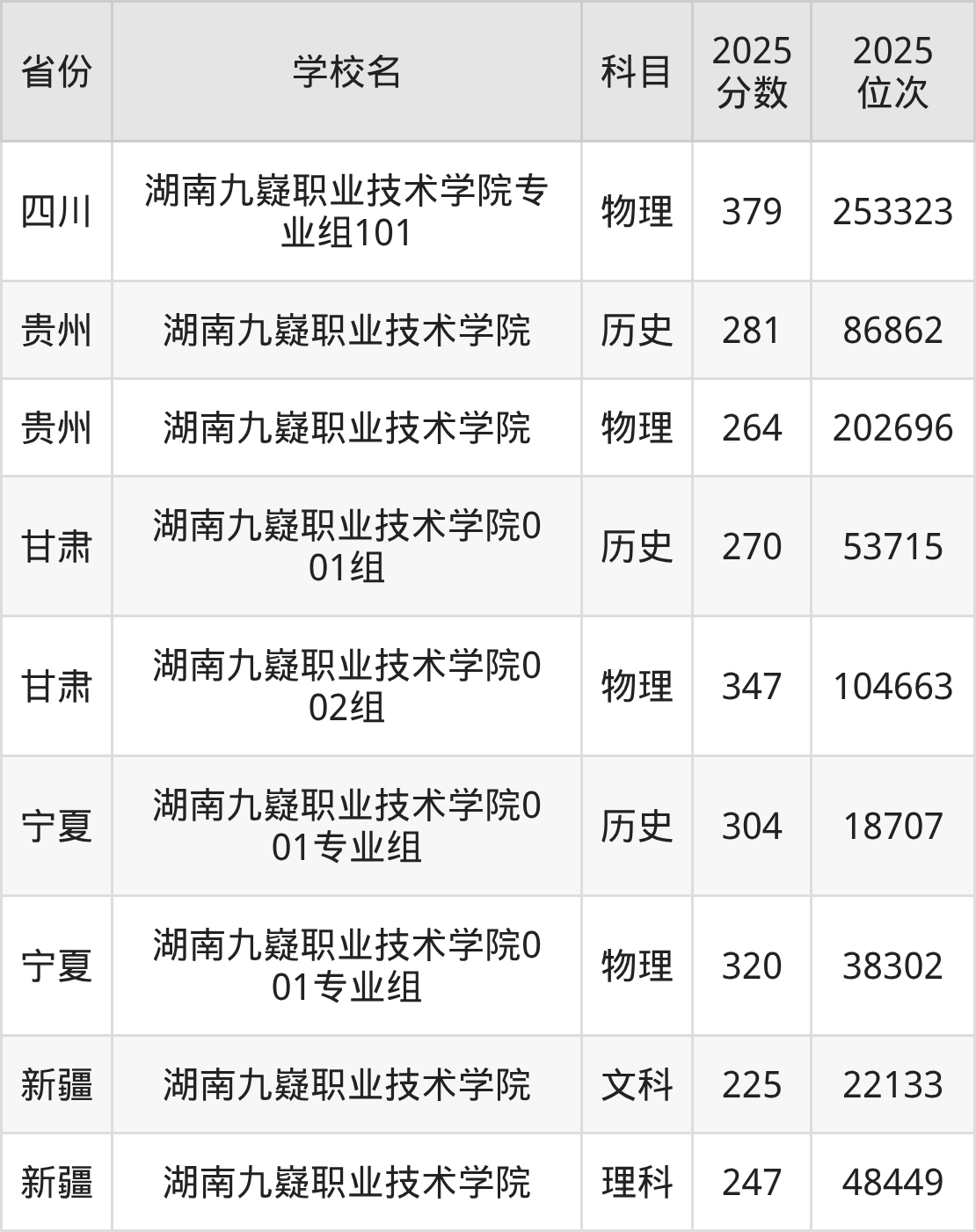 下面是湖南九嶷职业技术学院2025年录取分数线各省汇总,一起来了解下吧。