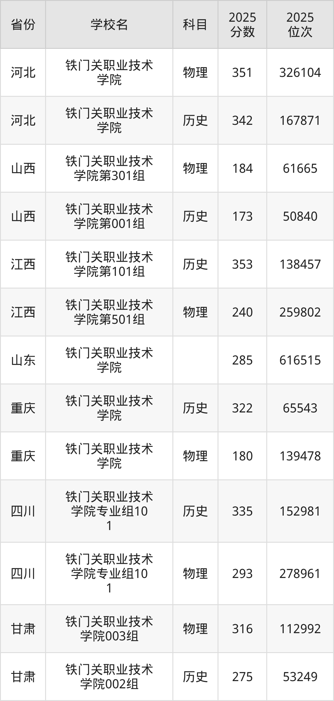 下面是铁门关职业技术学院2025年录取分数线各省汇总,一起来了解下吧。