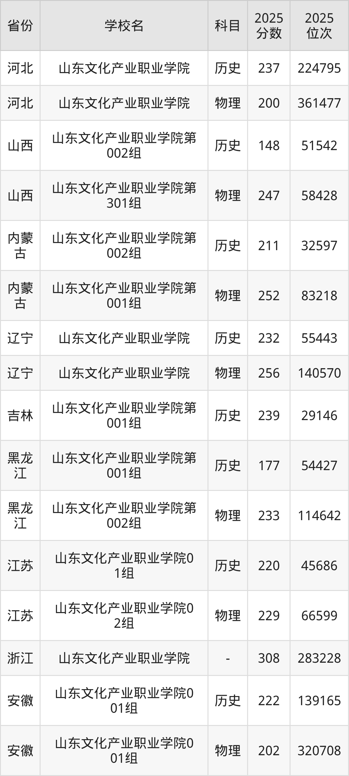 2025年山东文化产业职业学院在省外录取分数线范围整体位于148分到383分之间,录取分数线最低在山西历史(第002组)、录取分数线最高在贵州物理。