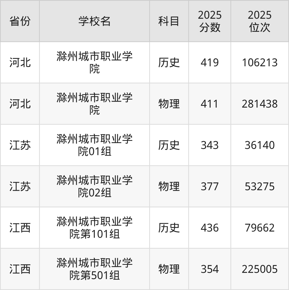 2025年滁州城市职业学院历史类最低分293分(127347名)、物理类最低分308分(306168名)。