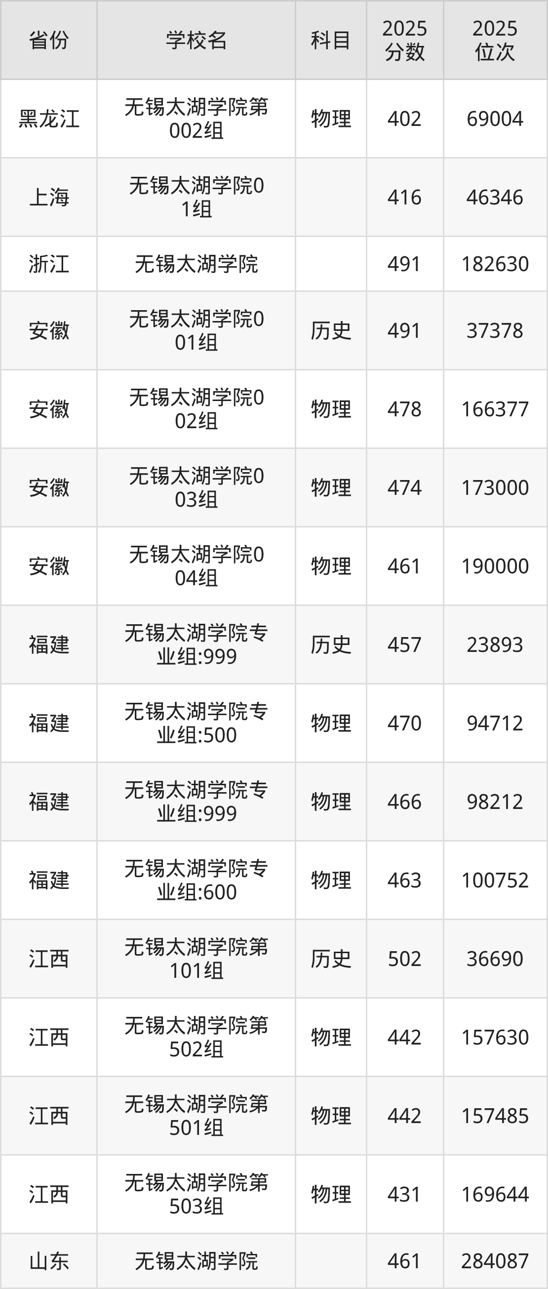 | 无锡太湖学院0 4组(中外合作 ) | 物理 | 470 | 198992 |