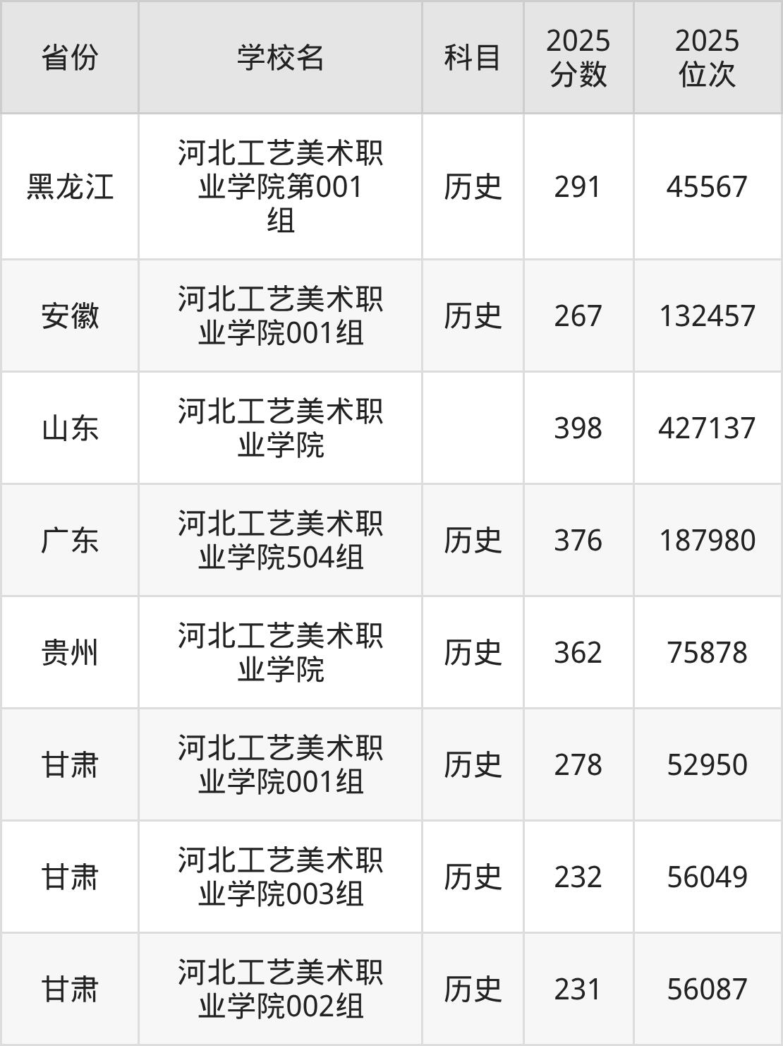 2026年河北工艺美术职业学院录取分数线预计在320分及以上,在各省录取最低分存在一定差异,如:2025年河北工艺美术职业学院在河北录取最低历史类408分、物理类396分,在黑龙江录取最低历史类291分,在安徽录取最低历史类267分。