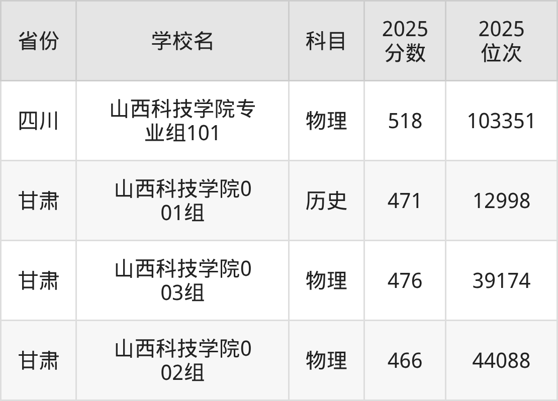 2025年山西科技学院在省内分历史物理科目类录取,其中历史类最低分是490分、对应位次是23133名;物理类最低分是451分,对应位次是98179名。