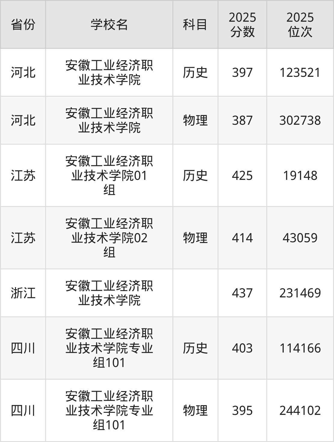 2026年安徽工业经济职业技术学院录取分数线预计在410分及以上,在各省录取最低分存在一定差异,如:2025年安徽工业经济职业技术学院在河北录取最低历史类397分、物理类387分,在江苏录取最低历史类425分、物理类414分,在浙江录取最低分是437分。