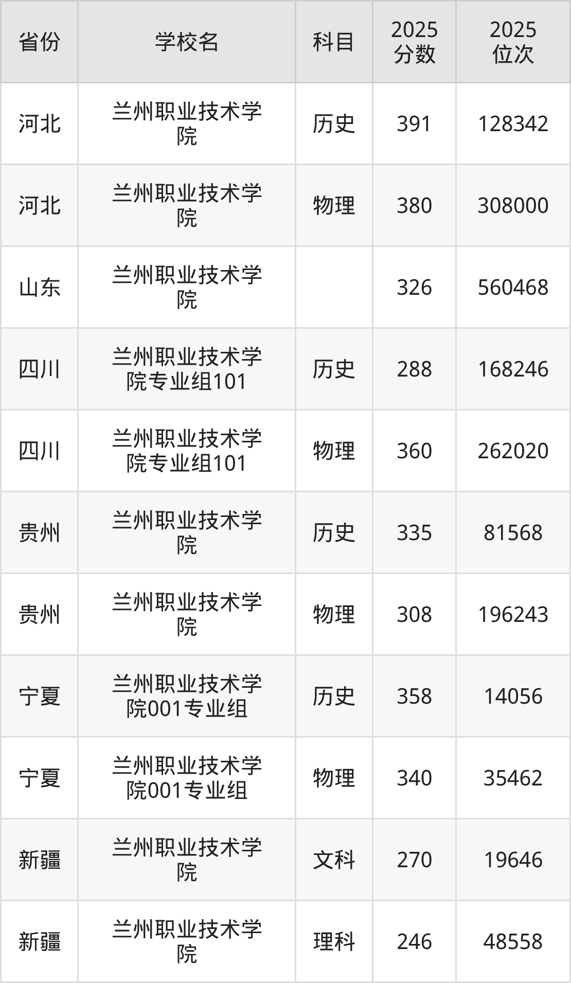2025年兰州职业技术学院历史类最低分326分(45047名)、物理类最低分344分(105681名)。