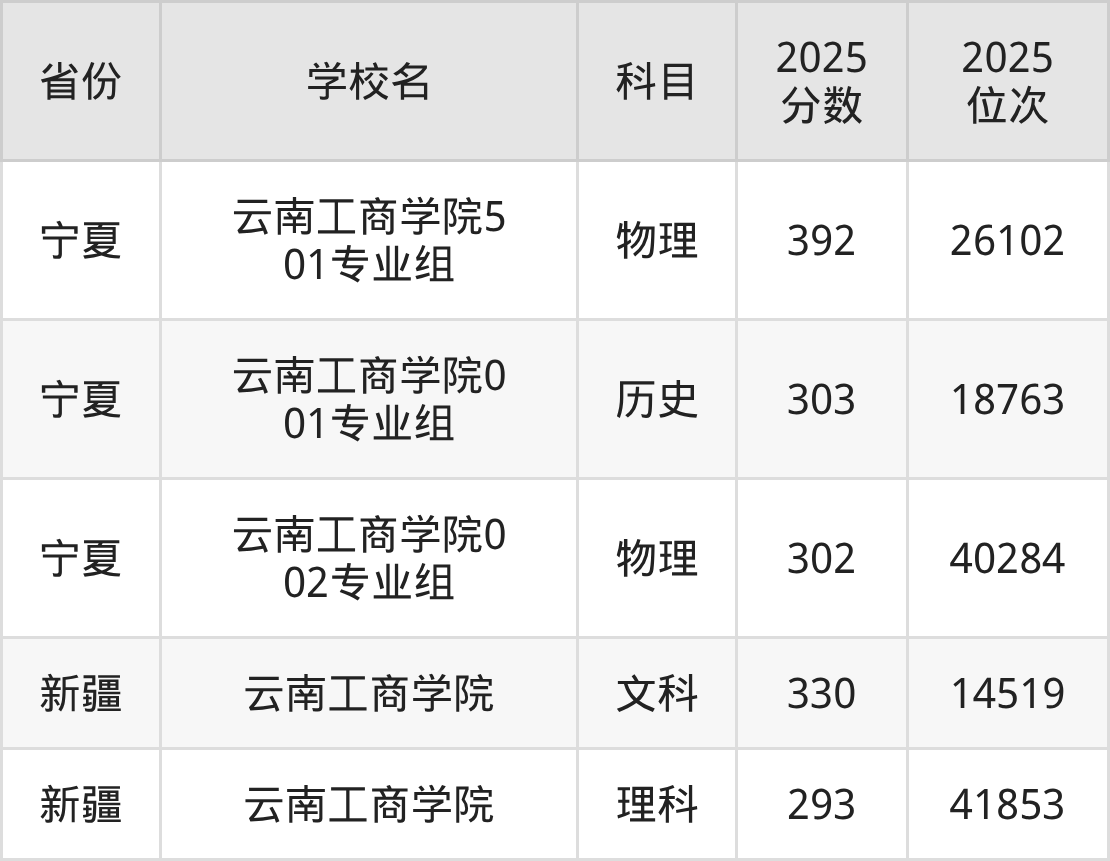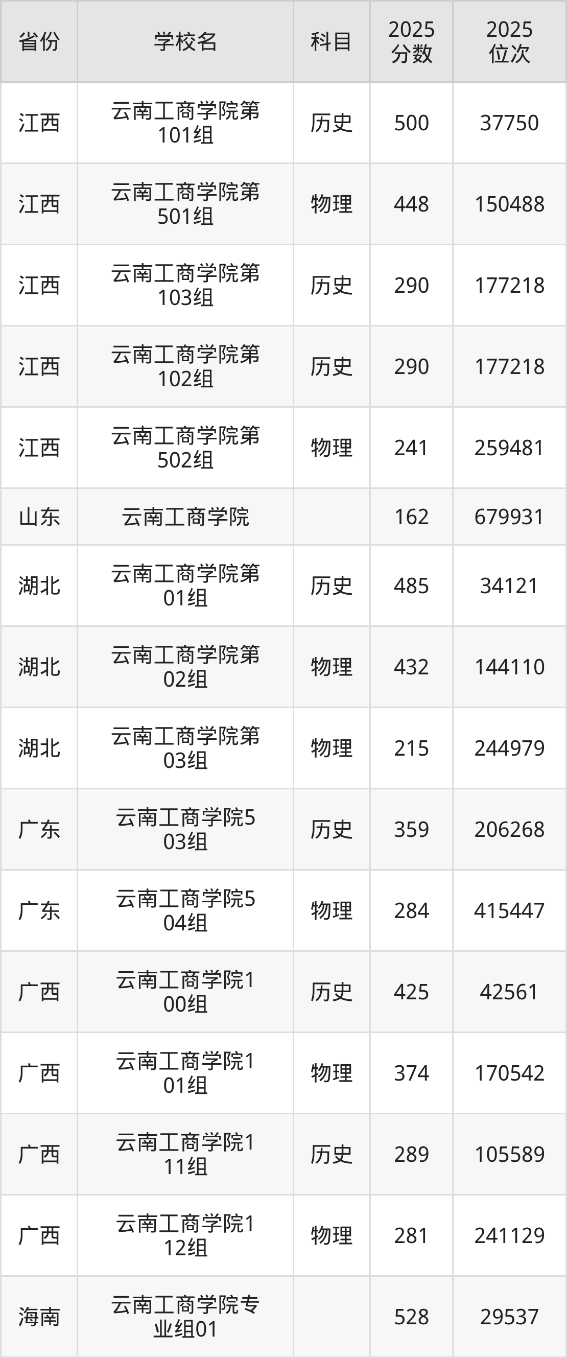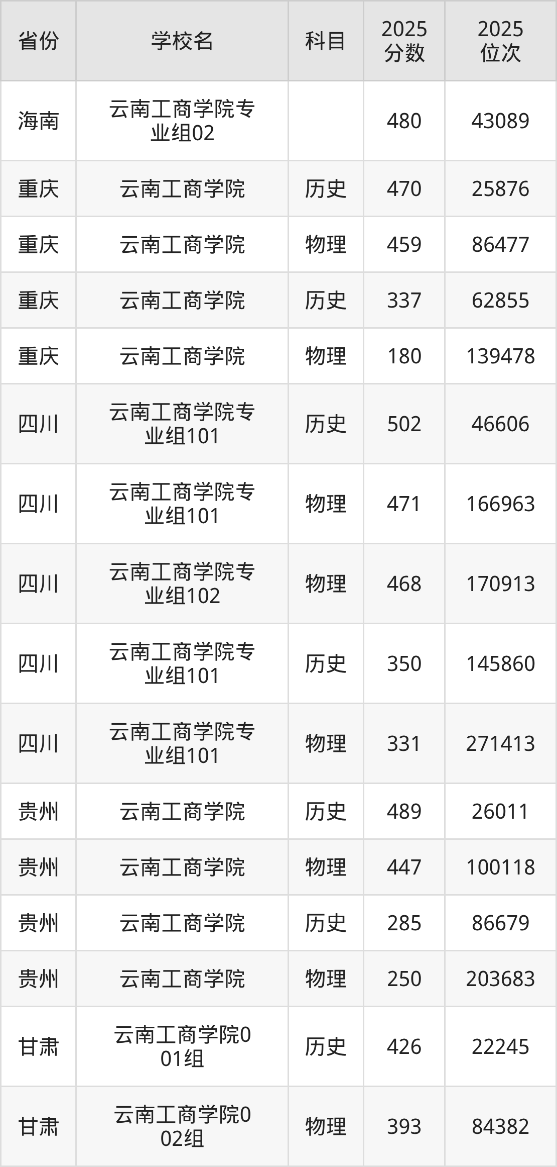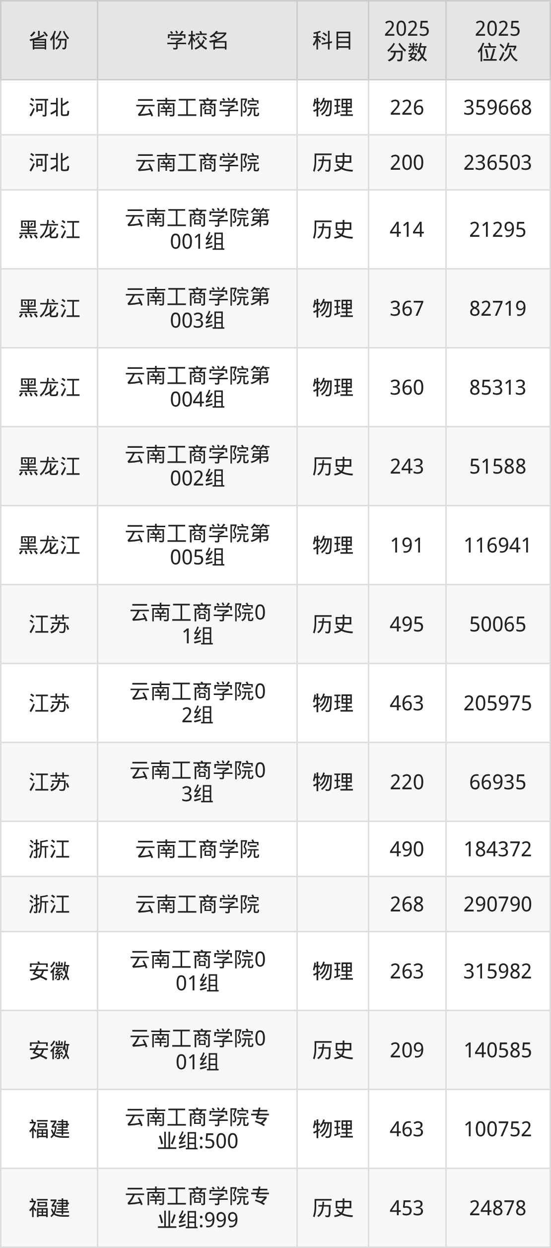 2025年云南工商学院历史类最低分337分(62855名)、物理类最低分180分(139478名)。