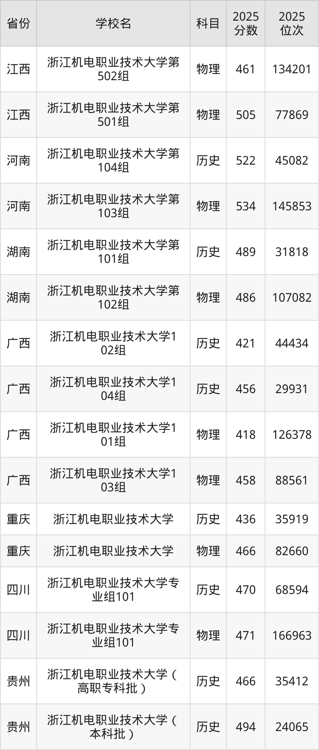 2025年浙江机电职业技术大学最低分508分(163298名)。