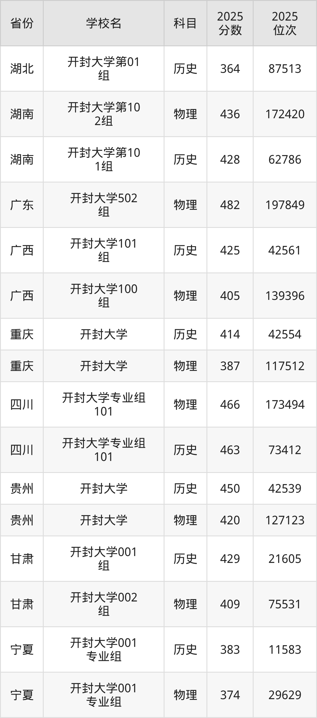 2026年开封大学录取分数线预计在420分及以上,在各省录取最低分存在一定差异,如:2025年开封大学在广西录取最低历史类425分、物理类405分,在四川录取最低历史类463分、物理类466分,在贵州录取最低历史类450分、物理类420分。
