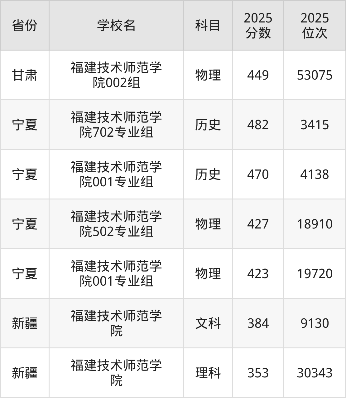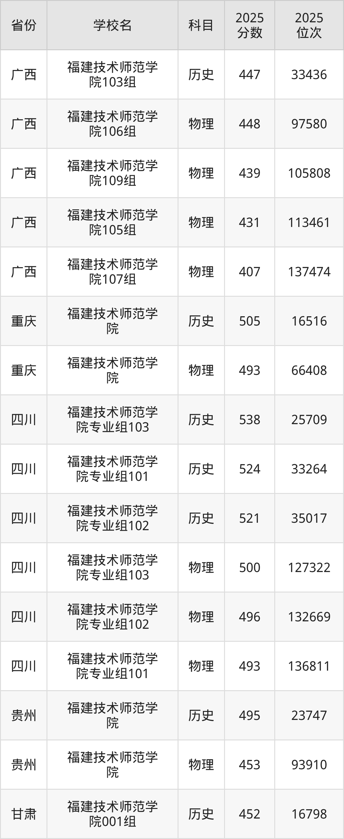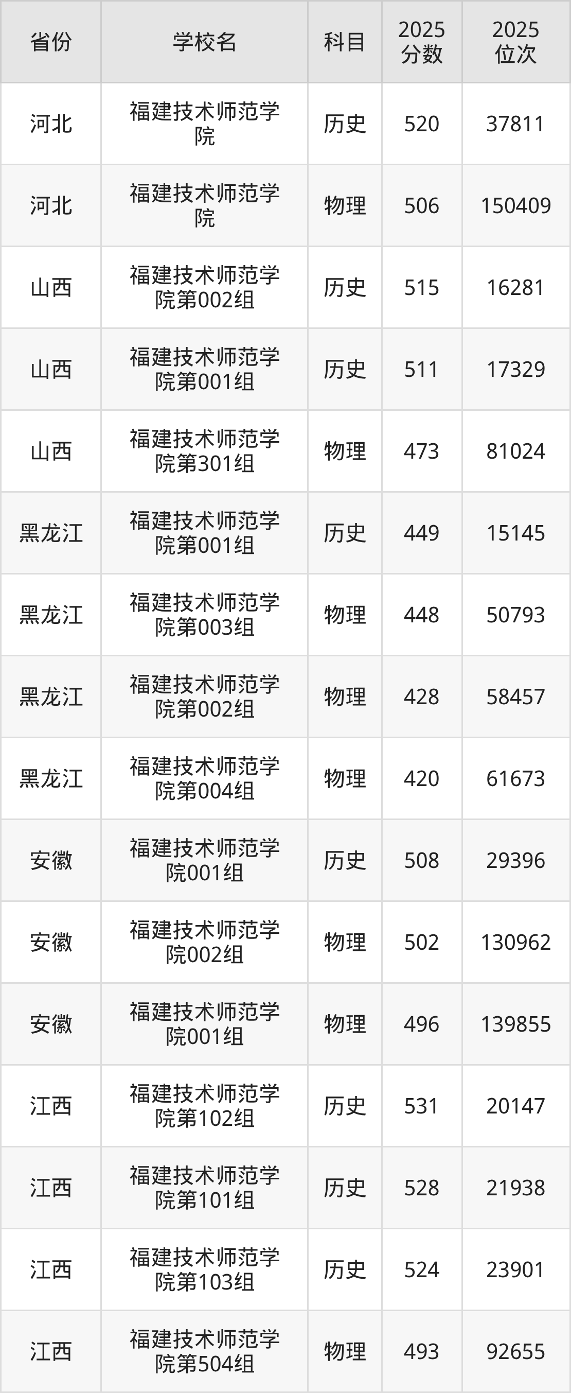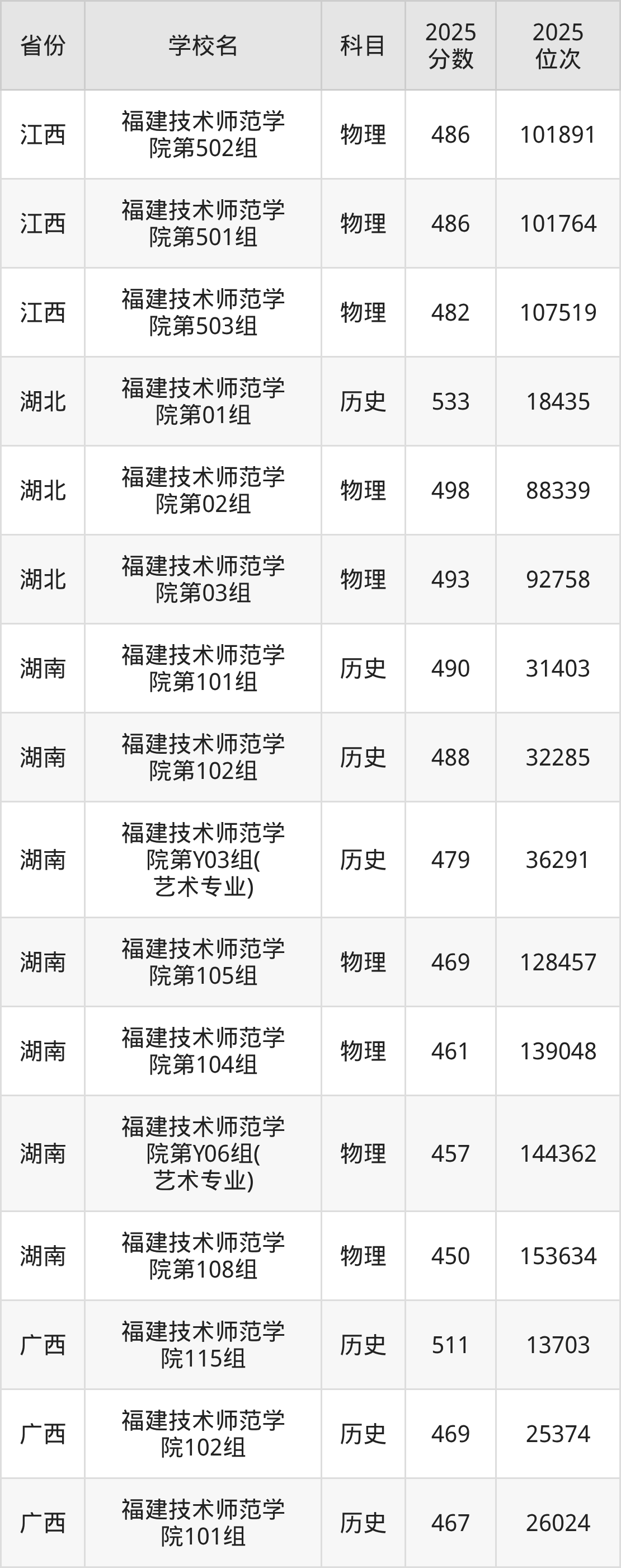 2025年福建技术师范学院历史类最低分498分(15098名)、物理类最低分489分(78616名)。
