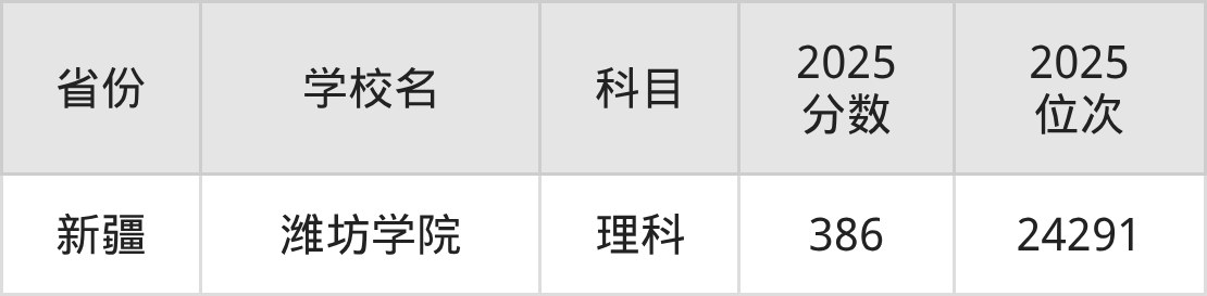 2025年潍坊学院在省外录取分数线范围整体位于386分到577分之间,录取分数线最低在新疆理科、录取分数线最高在海南(专业组01)。