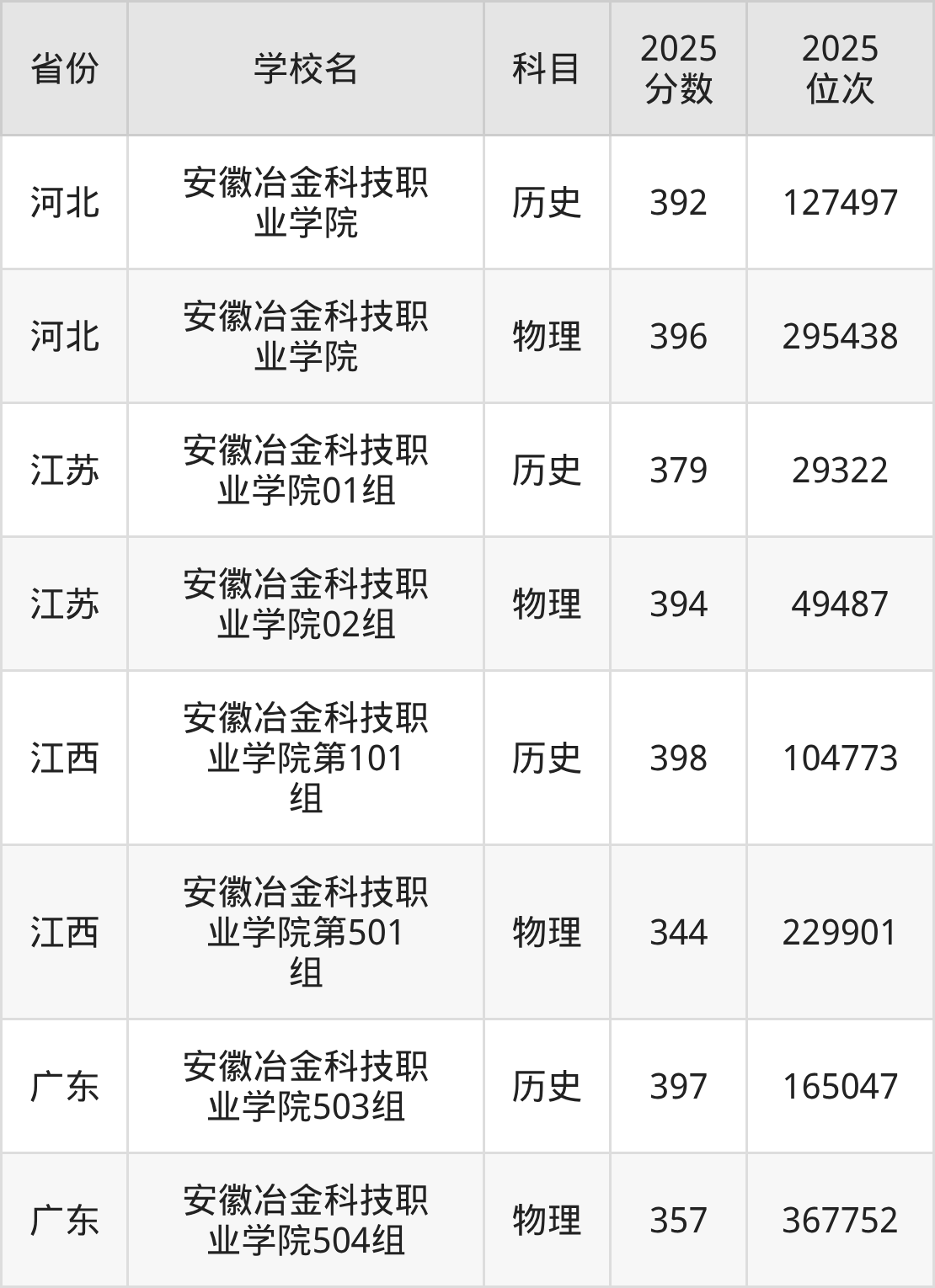 下面是安徽冶金科技职业学院2025年录取分数线各省汇总,一起来了解下吧。